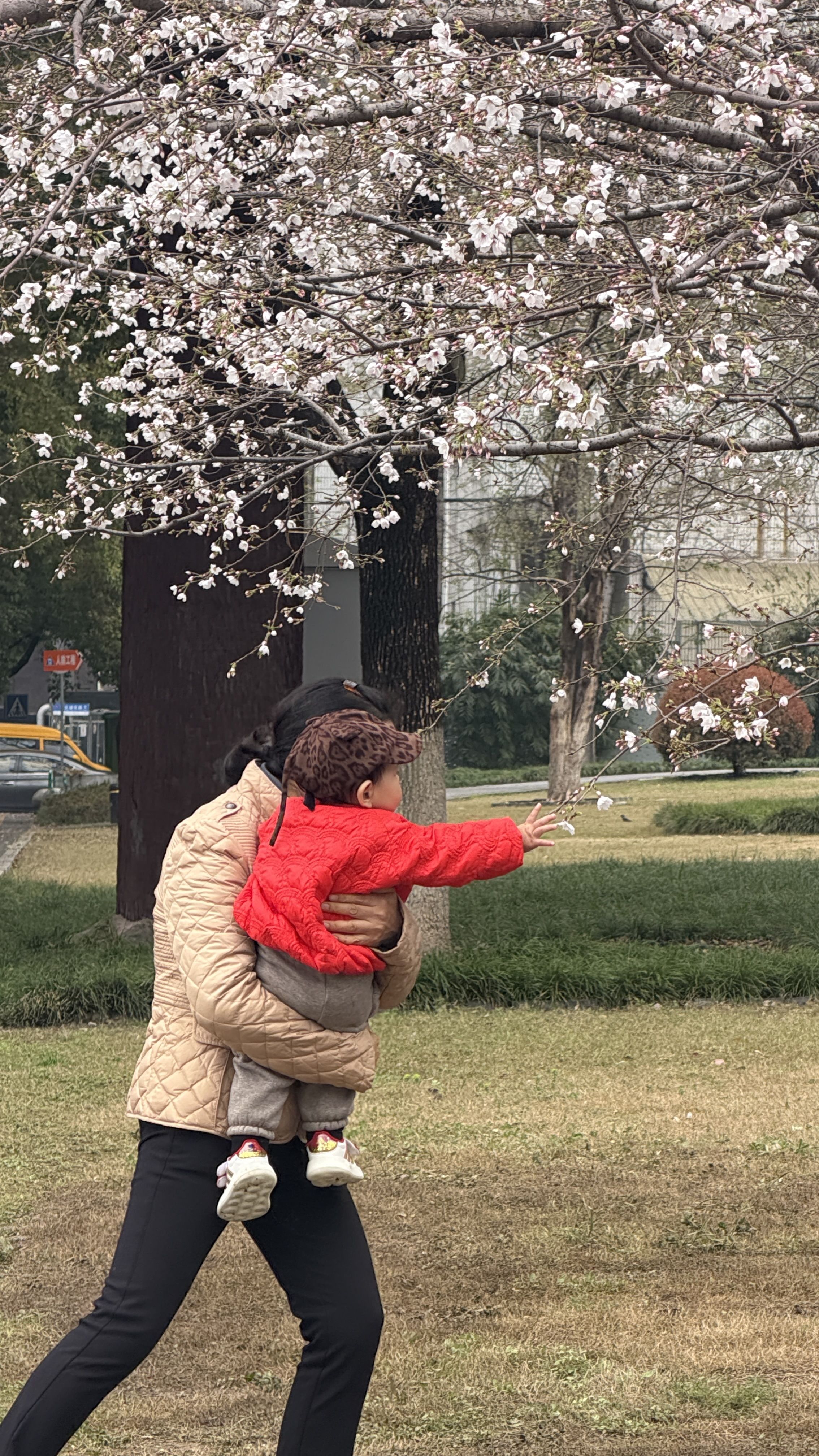 3月17日下午,天晴了,市民抱着孩子在西北湖赏樱花。王喆 摄