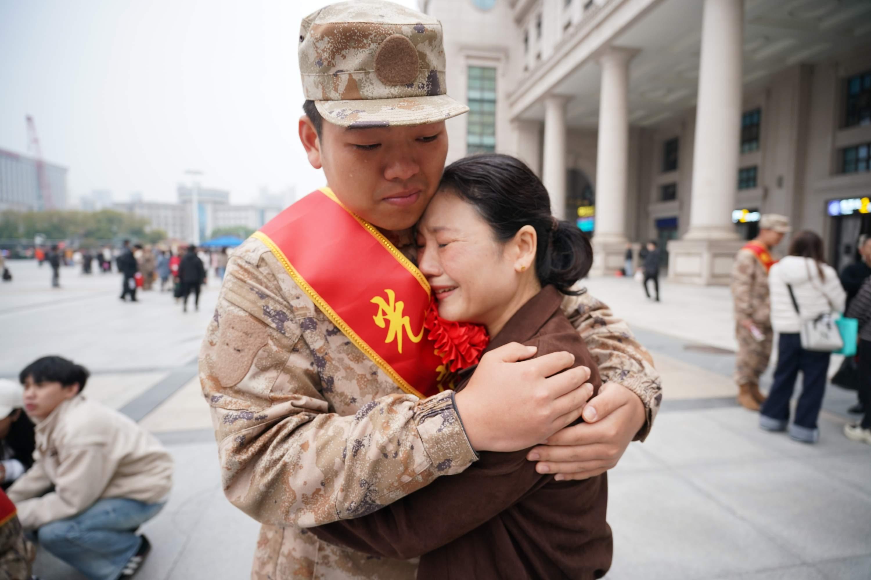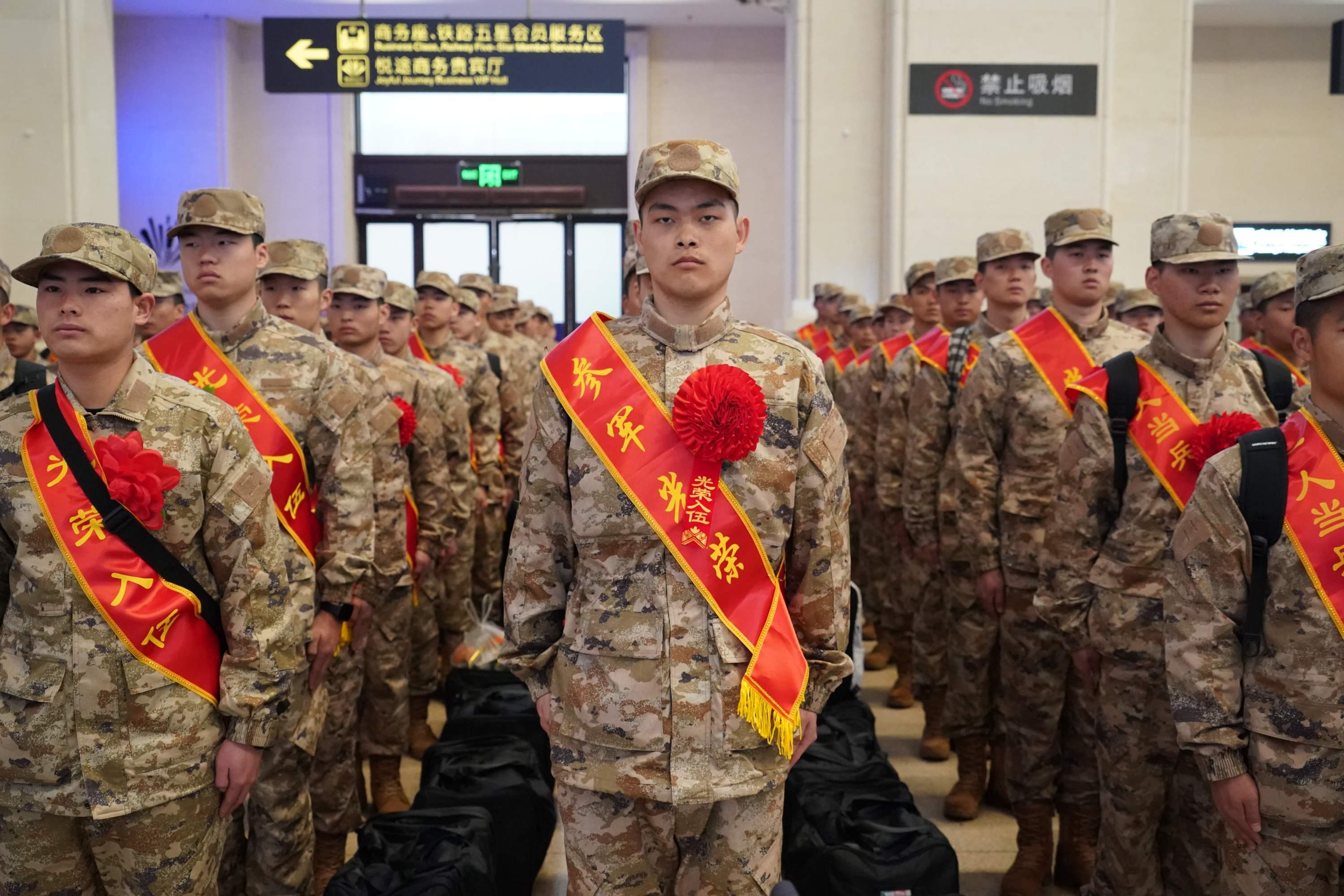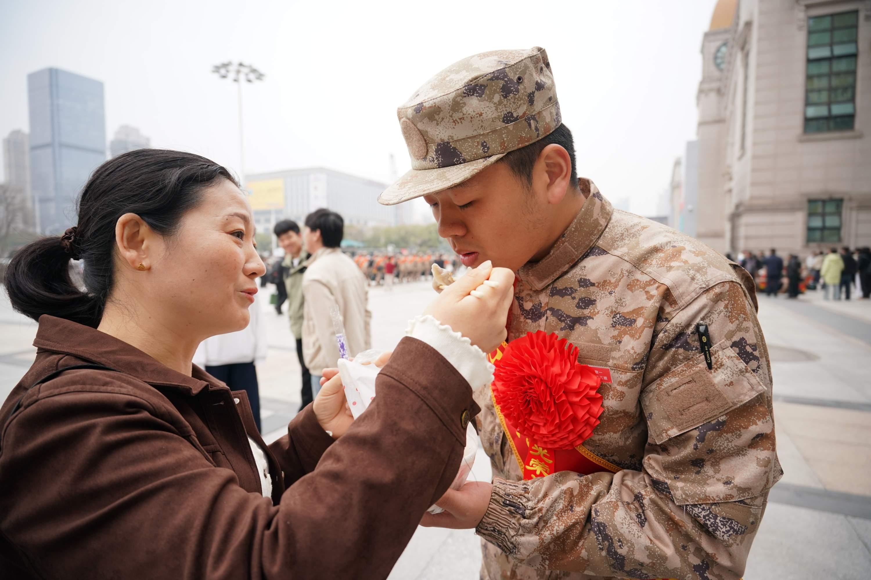 3月20日上午,湖北省2026年新兵入伍欢送仪式在武汉市汉口站举行。今年上半年在湖北省应征入伍的部分新兵穿着戎装、胸戴大红花、披着写有“光荣入伍”大字的绶带参加仪式。他们在这里与亲朋告别,乘坐列车前往部队报到。