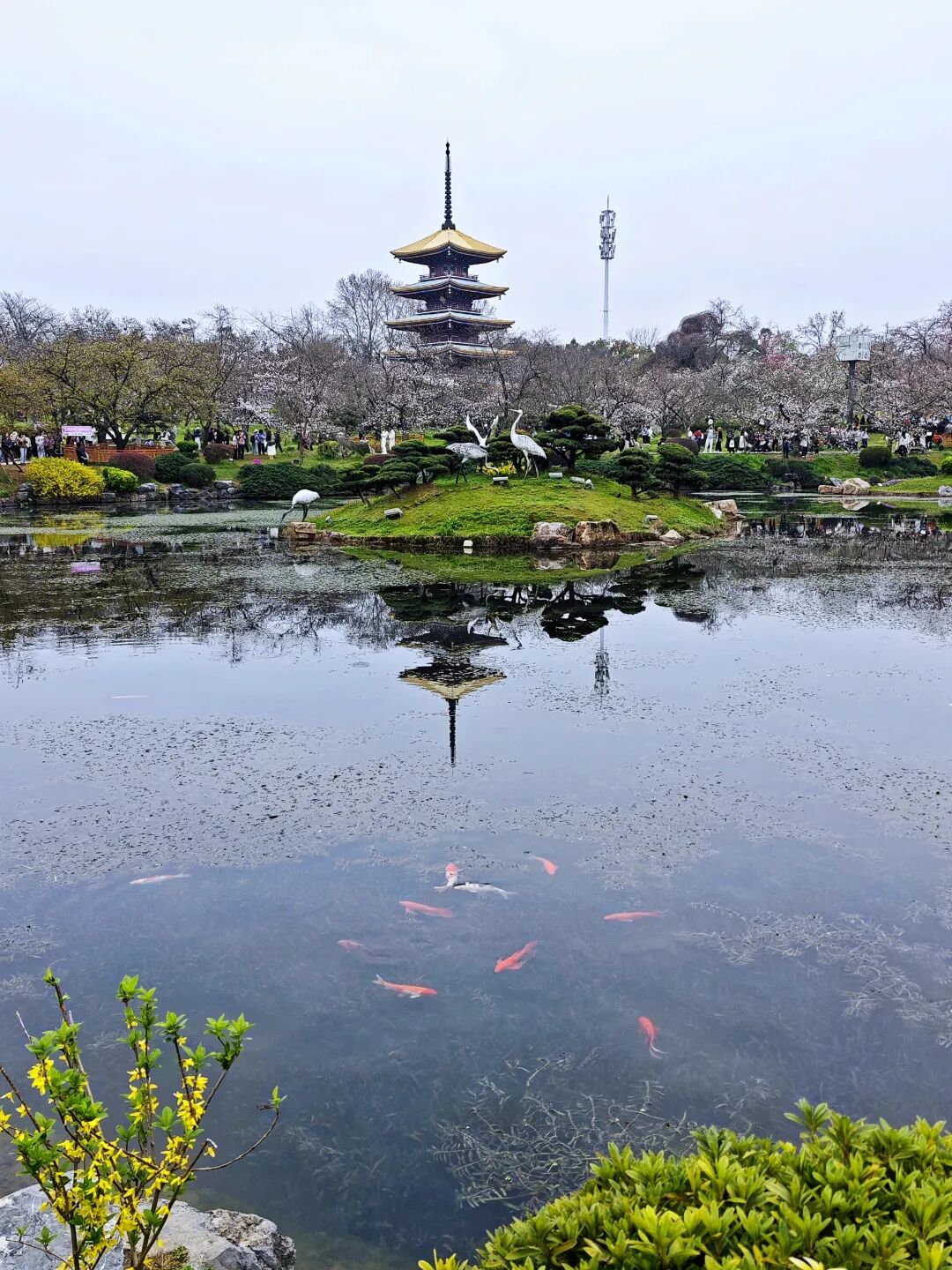 风一吹,下起了樱花雨。花瓣飘在水面,沾在五重塔影上,也落在游鱼的身边。空气里也裹着樱花的甜香,这便是江城春意盎然的模样。