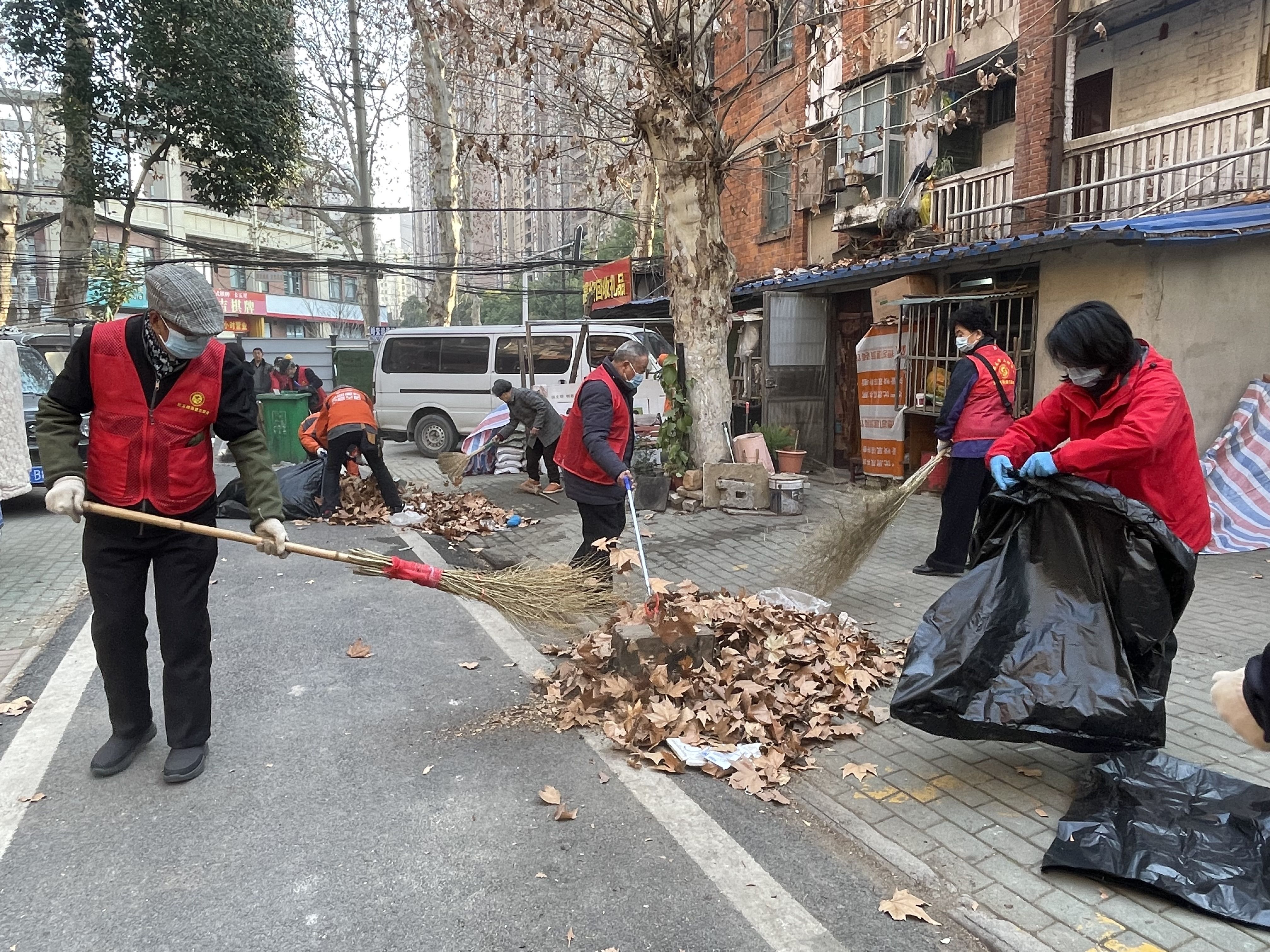 虹蔚社区志愿者清扫路面,做好赛场周边环境维护。