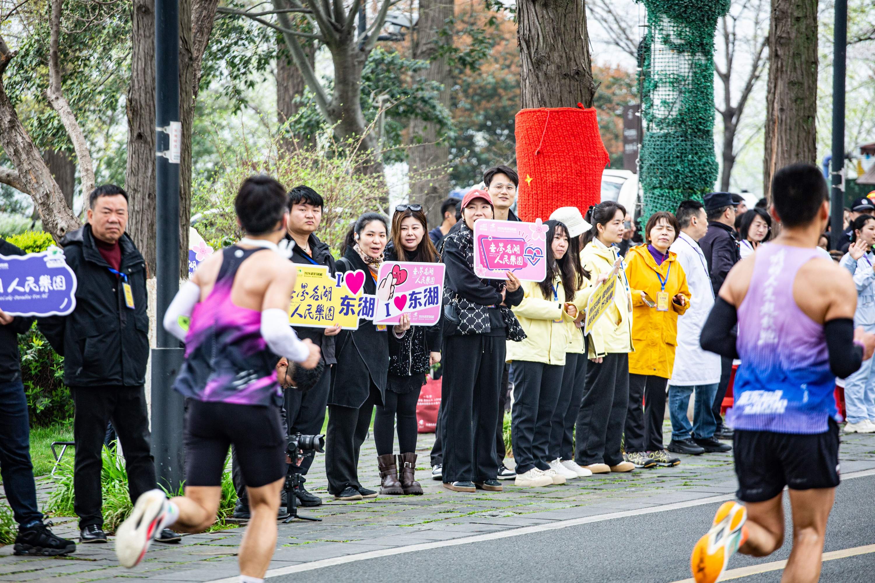 不仅是有组织的表演,东湖的热情更是渗透在每一个角落。清晨天未亮,东湖风景区各部门的工作者就已早早到岗,在完成赛道保障本职工作的间隙,他们许多人自发手持“汉马加油”“东湖为你喝彩”“樱花满径 步履生风”“花开正好 奔跑当时”等手举牌,站在赛道旁,以最质朴的笑容和呐喊,为跑者送上来自“东湖主人”的鼓励。44岁的上海选手段鹏涛则兴奋地说:“我跑了60多场马拉松了,今年是第二次参加汉马,最大的感受就是这里的朋友们太热情了,尤其是经过东湖这段,有传统舞蹈的表演,还有学生的加油,气氛非常好,我下次还想来武汉跑马拉松!”