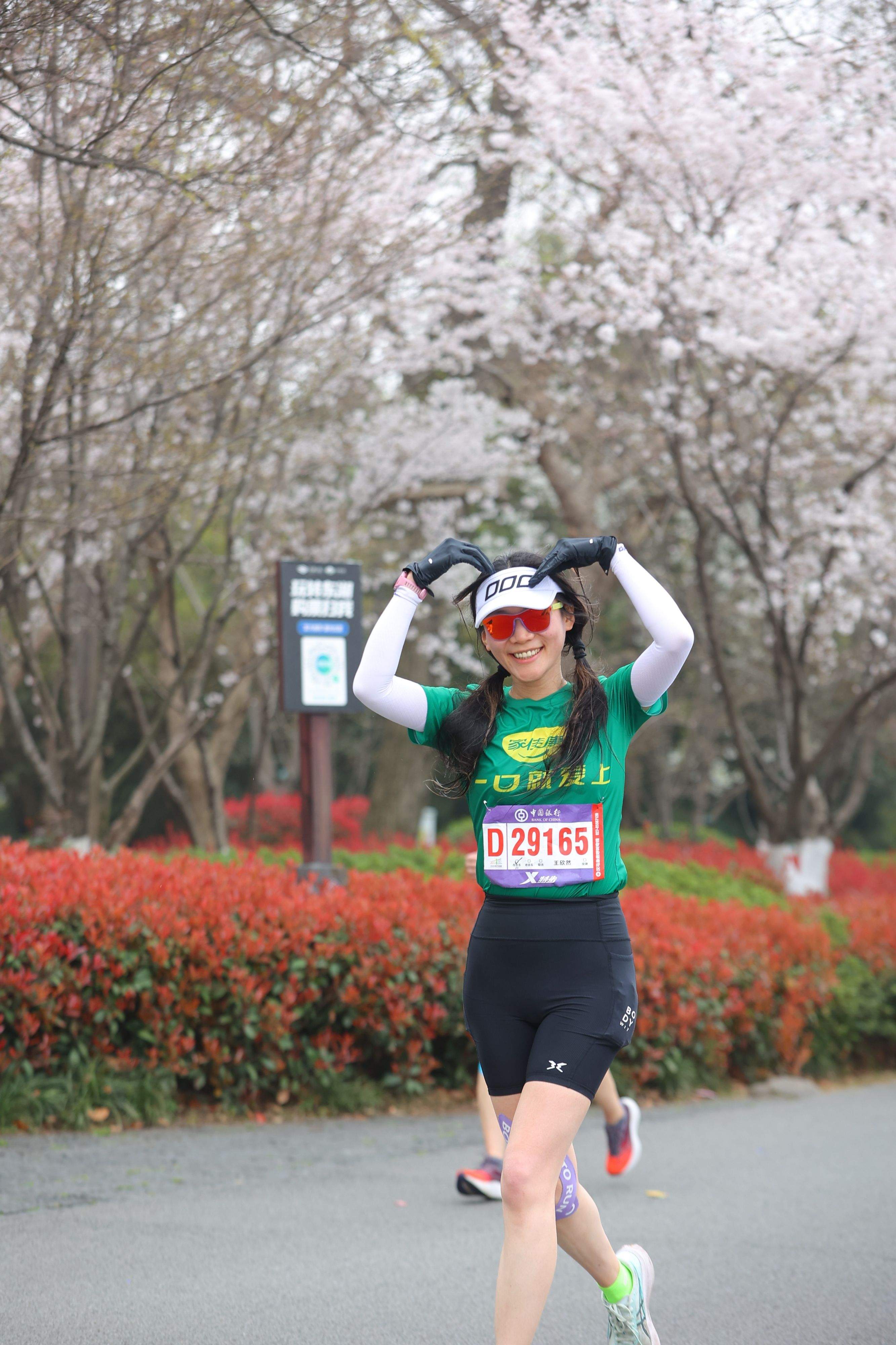 跑在樱花下,汉马选手连连比心。