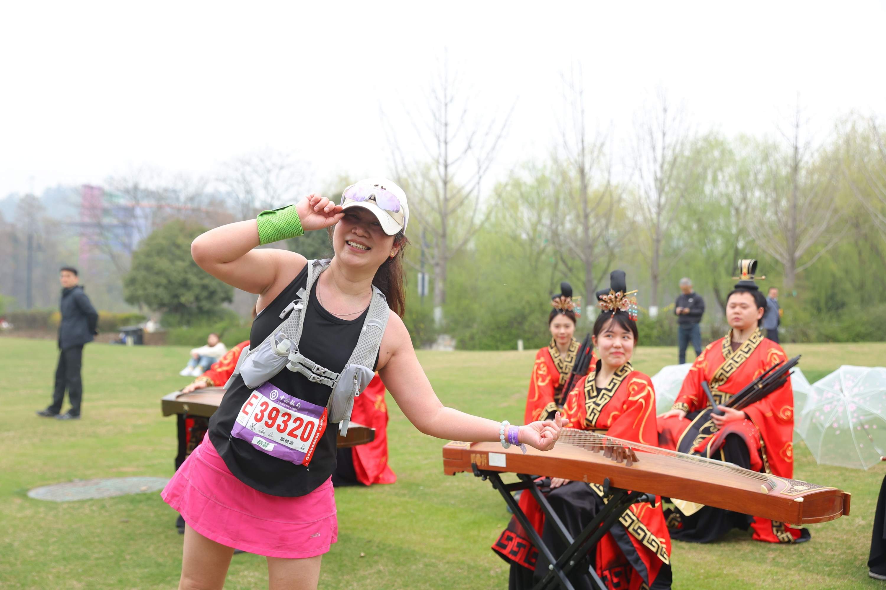 汉马选手停下脚步,与楚风汉韵的加油站乐手们互动合影。