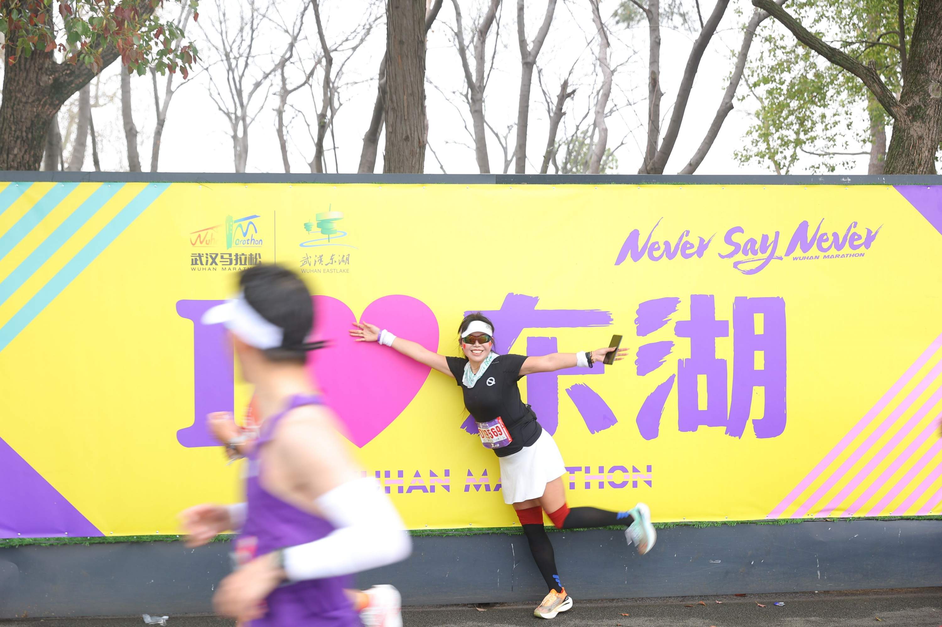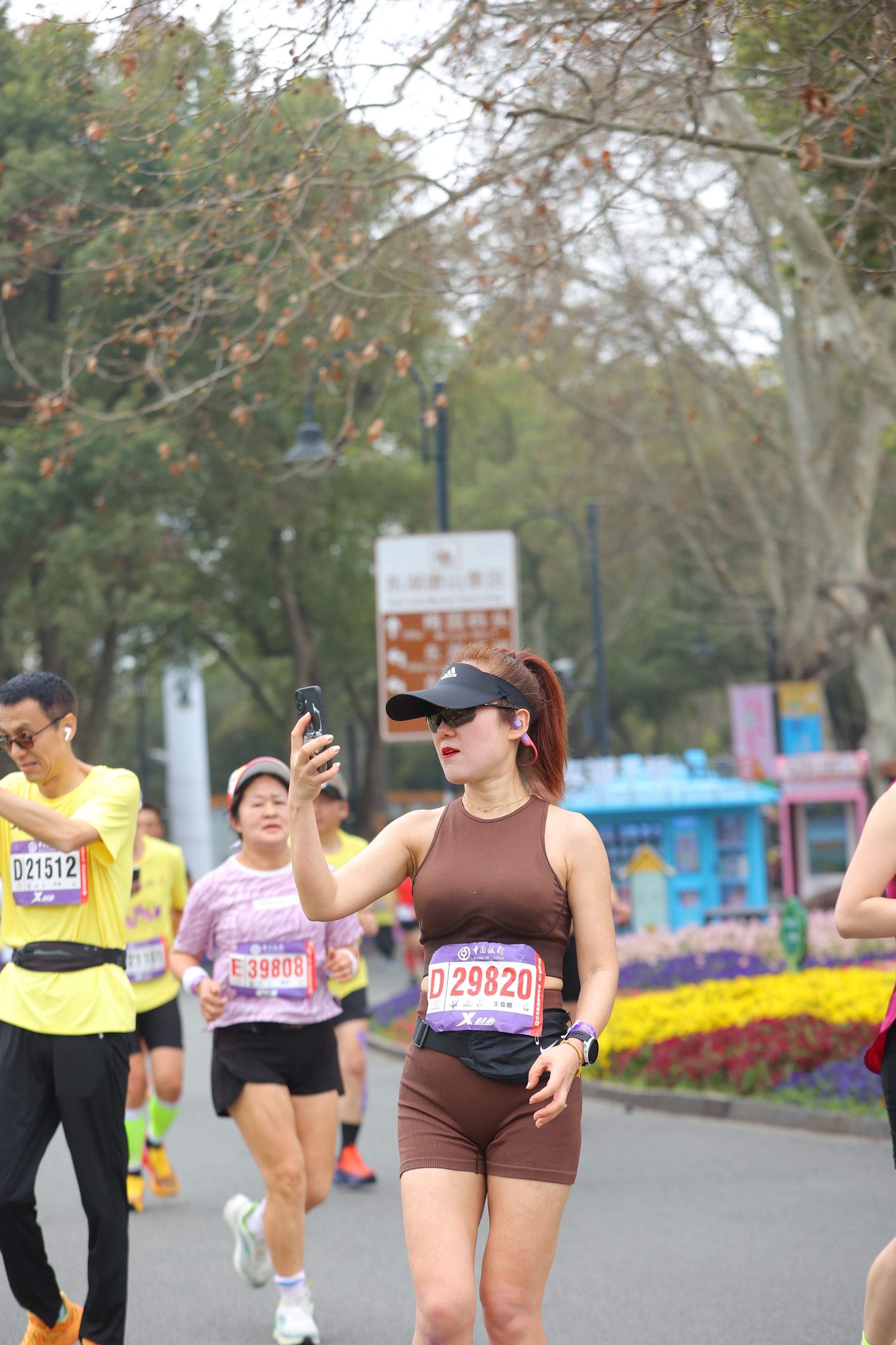 来到东湖赛段,汉马选手们纷纷忍不住举起手机拍起照来。