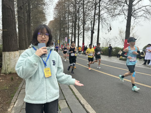 武汉外国语学校高二八班陆芙瑞正用中英双语热情推介汉马东湖赛道。