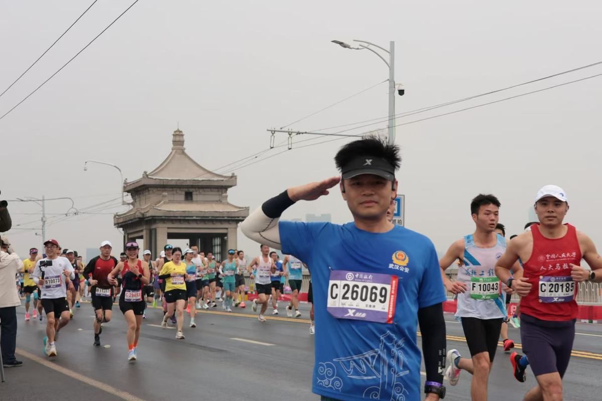 “加油、加油,跟上步伐,过了上坡后面就好跑了!”3月22日上午9点,2026武汉马拉松参赛选手行进至长江大桥赛段连续的上桥爬坡,让不少跑者的呼吸渐渐沉重,队伍行进速度明显放缓。人群中,身着蓝色护跑服的“武汉公安汉马护跑团”队员、武昌区分局民警王金涛一边稳住配速领跑带节奏,一边高声为身边的选手加油鼓劲。