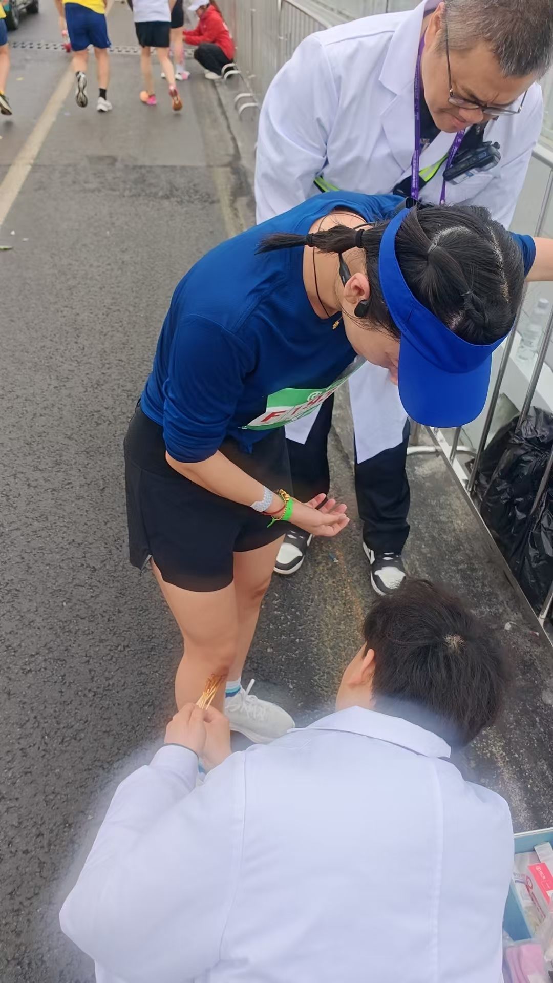 经询问,这名选手是专程从广州来参加武汉马拉松的跑友,摔倒时膝盖和手掌都有擦伤,脚踝也有轻微扭伤。安嶷峰小心翼翼地把她扶到赛道边的医疗救助点,陪着医护人员帮她消毒、包扎伤口,等她状态稍有缓解后,又放心不下她独自继续参赛。