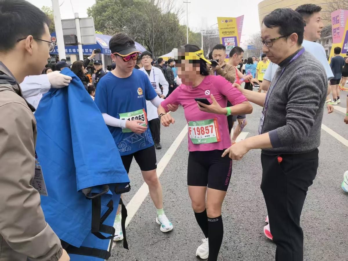 暖心守护,同样也发生在半程马拉松的终点线。黄陂区分局交通管理大队辅警黄恒刚刚冲过终点线,还没来得及调整呼吸,就看到身侧一名刚冲线的女选手突然身子一软,抱着抽筋的腿蹲在了地上,疼得额头直冒冷汗。