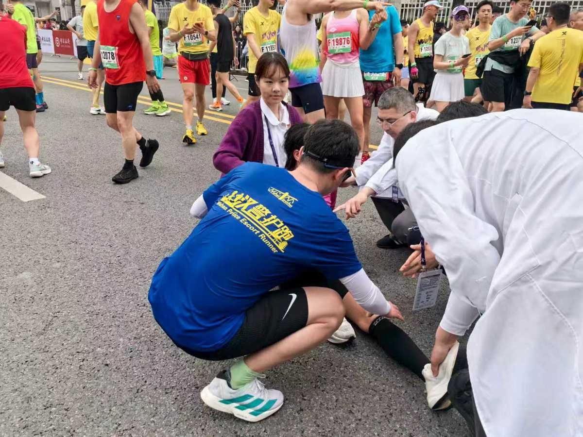 黄恒立刻快步上前,一边扶住了快要摔倒的选手,一边招呼不远处的医护人员,同时凭着赛前培训学到的急救知识,帮选手慢慢伸直腿部、做简单的拉伸放松,缓解肌肉痉挛。等医护人员赶到后,他又和医护人员一起,把选手抬到了旁边的治疗站。“我们护跑团的职责,不只是冲过终点,只要有选手需要,我们就得上前。”