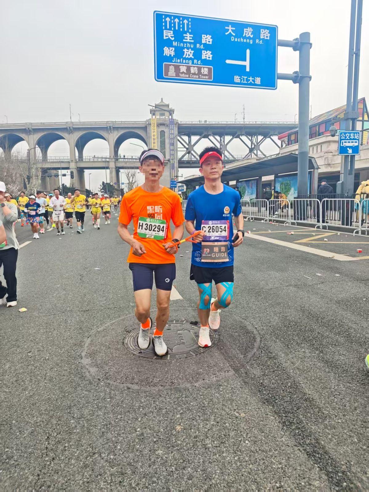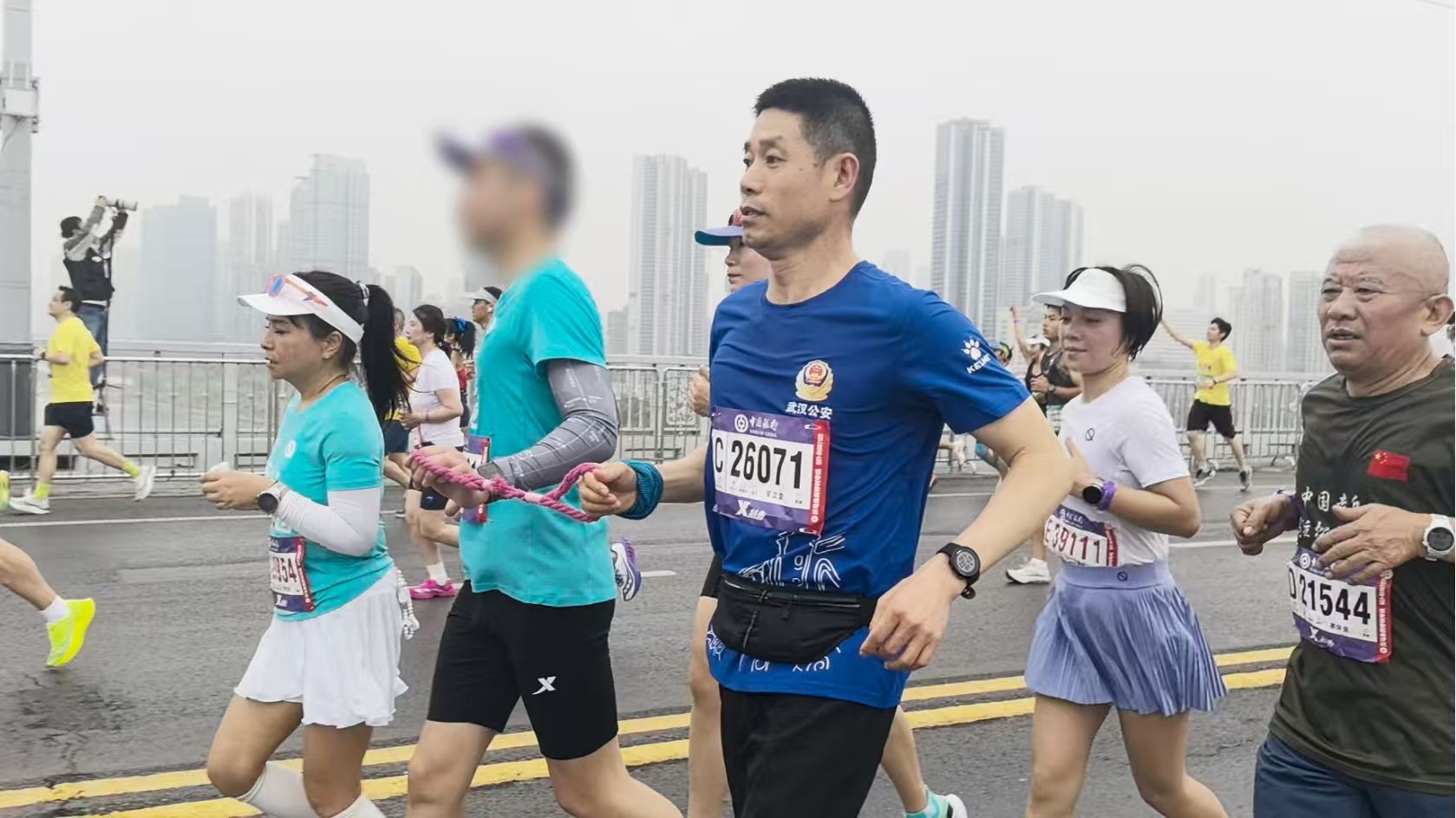 在全程马拉松的赛道上,同样为视障跑者保驾护航的,还有武汉市公安局青山区分局巡特警大队民警黄立望,今年是他第7次参与武汉马拉松,早已是护跑团里经验丰富的“老将”。
