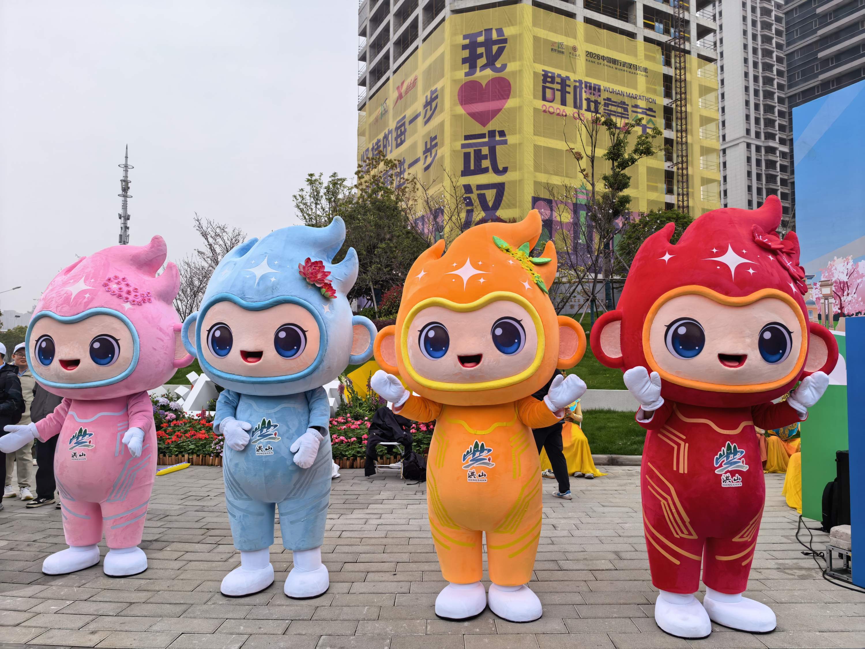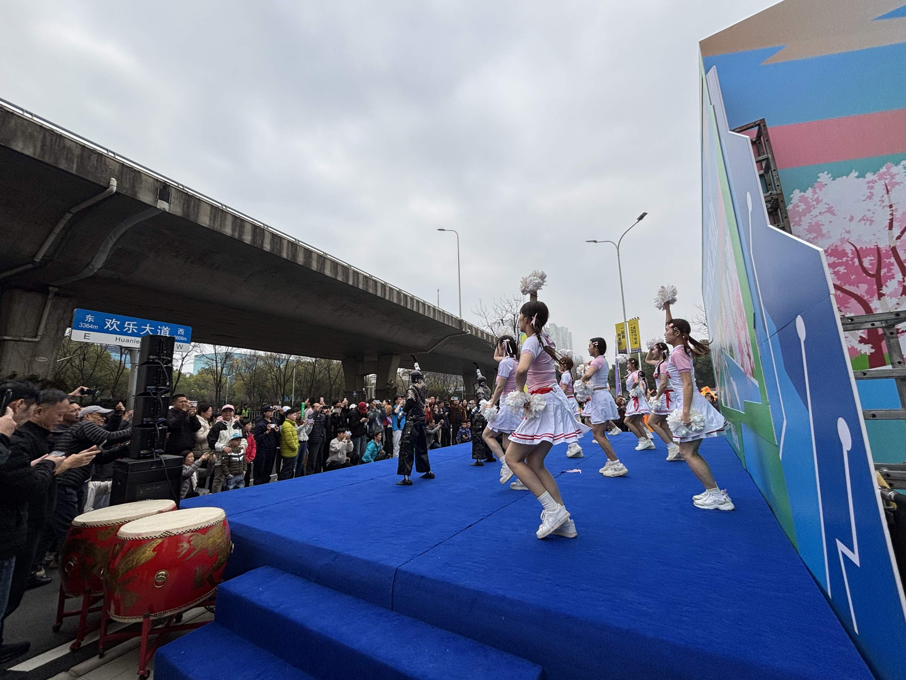 今年,洪山区仁和路首次被纳入汉马赛道,宽阔平整的柏油路两侧,樱花缀满枝头。上午8时许,赛道沿线已进入热场模式。东湖九号展台上,机器人挥舞机械臂与身着四季彩装的“洪小体”人偶一同跃动,动感的音乐与威风锣鼓震天作响,志愿者的助威声此起彼伏。