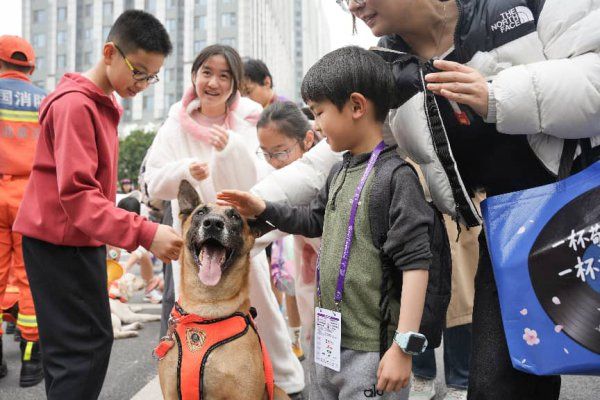 在互动区,拉布拉多犬“安妮”、马犬“迪迦”和史宾格“可可”化身“明星接待员”,轮番与游客进行近距离互动。大家排起长队依次与三只小家伙互动。