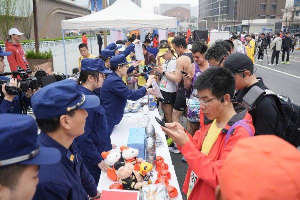 当天上午9时许,武汉SKP商场展位前已是人声鼎沸,作为半程马拉松的终点,这里聚集了不少刚刚冲线的选手。一旁的消防宣传主题互动区内人气高涨,众多完赛选手驻足参与答题活动。刚刚以1小时45分成绩完赛的王先生擦着额头的汗水,盯着手机屏幕认真思考一道关于高层建筑火灾逃生题目的答案。消防员在互动区设置了10道题目。