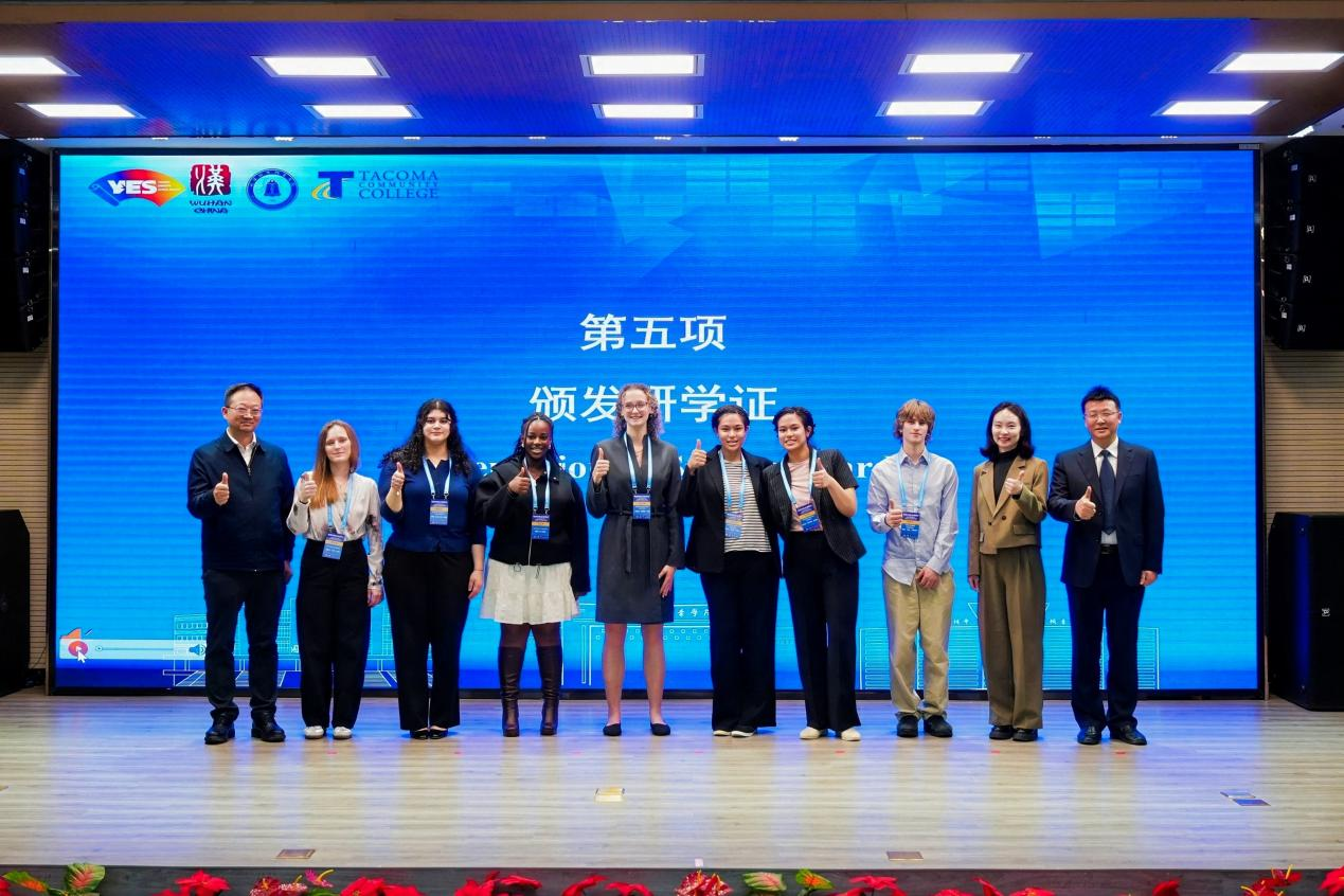 湖北省教育厅、武汉市委外办、武汉市教育局、学校领导共同为美国塔科马社区学院学生颁发研学证书并合影留念,标志着他们的武汉研学之旅正式开启。