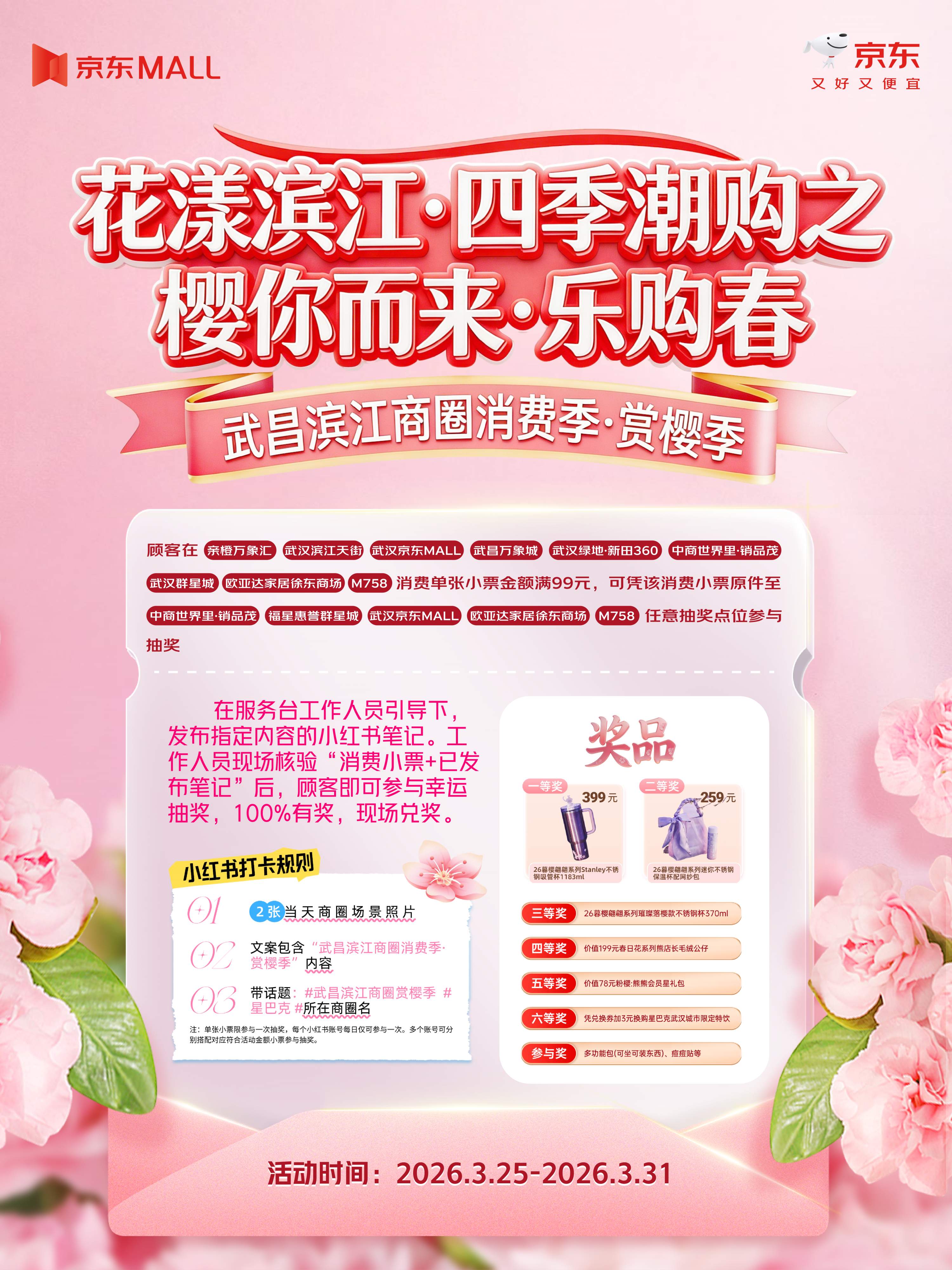 本次赏樱季活动吸引了武昌滨江商圈联盟9家商业体参与,包括亲橙万象汇、武汉滨江天街、武汉京东MALL、武昌万象城、武汉绿地·新田360、M758、中商世界里·销品茂、欧亚达家居徐东商场、群星城。