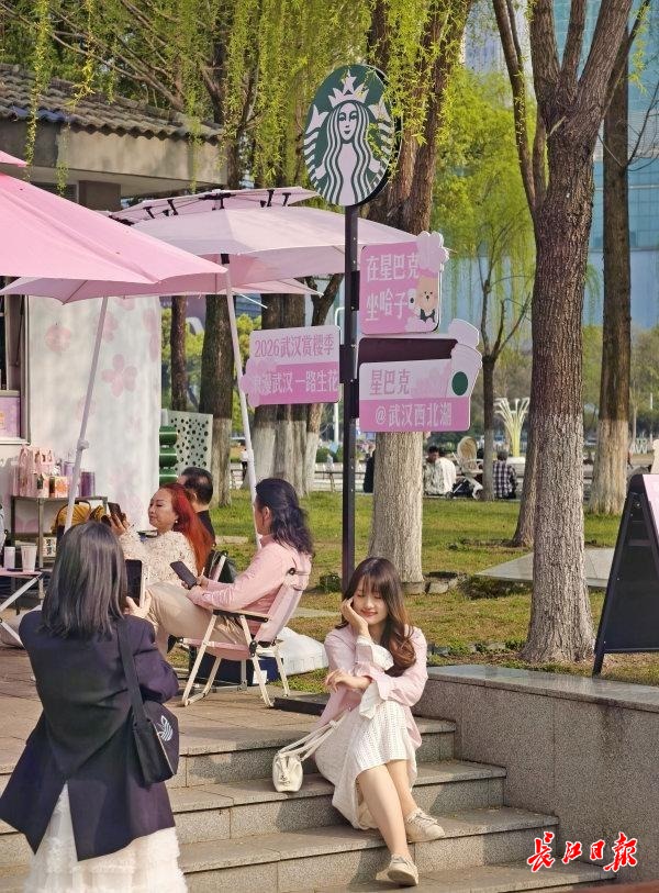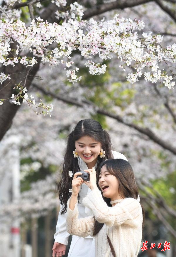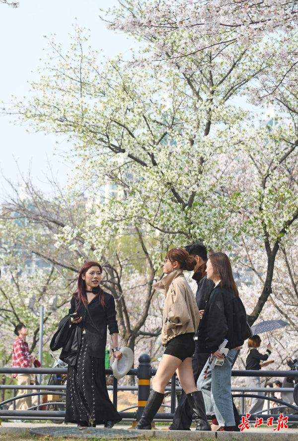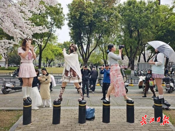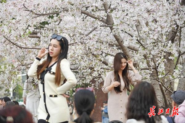 3月25日,汉口西北湖公园,几位女孩在樱花树下“站桩”拍照,引得路人驻足。