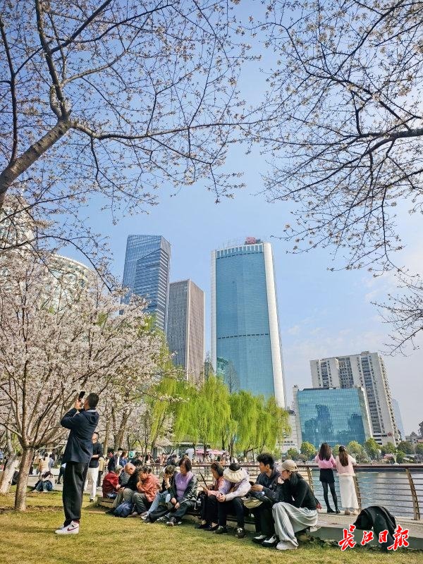 3月25日,汉口西北湖公园,市民游客在城市高楼与樱花树下感受春日风光。