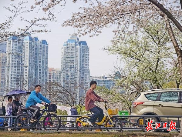3月25日,汉口西北湖公园,游客在花间小路骑行。