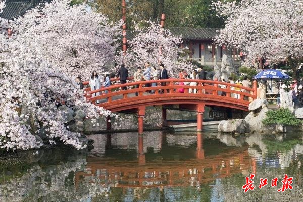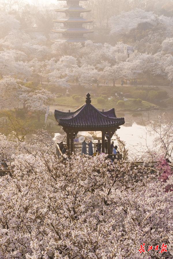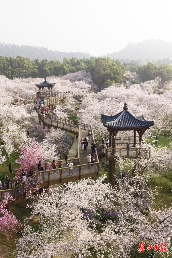东湖樱花园作为世界级赏樱胜地,占地数百亩,园内数十种中樱品种竞相开放,花瓣层层叠叠、轻盈柔美,粉白、淡粉、柔白的花色交织,远观如云似霞,近看娇俏动人。微风拂过,花瓣簌簌飘落,宛若樱花雨漫天飞舞,漫步其间,仿佛踏入童话般的梦幻世界,一步一景皆是诗意。园内独具特色的曲桥回廊、湖光水色与漫天樱花相映成趣,薄雾轻绕时,更添几分东方古典意境,尽显江南春日的温婉与雅致。