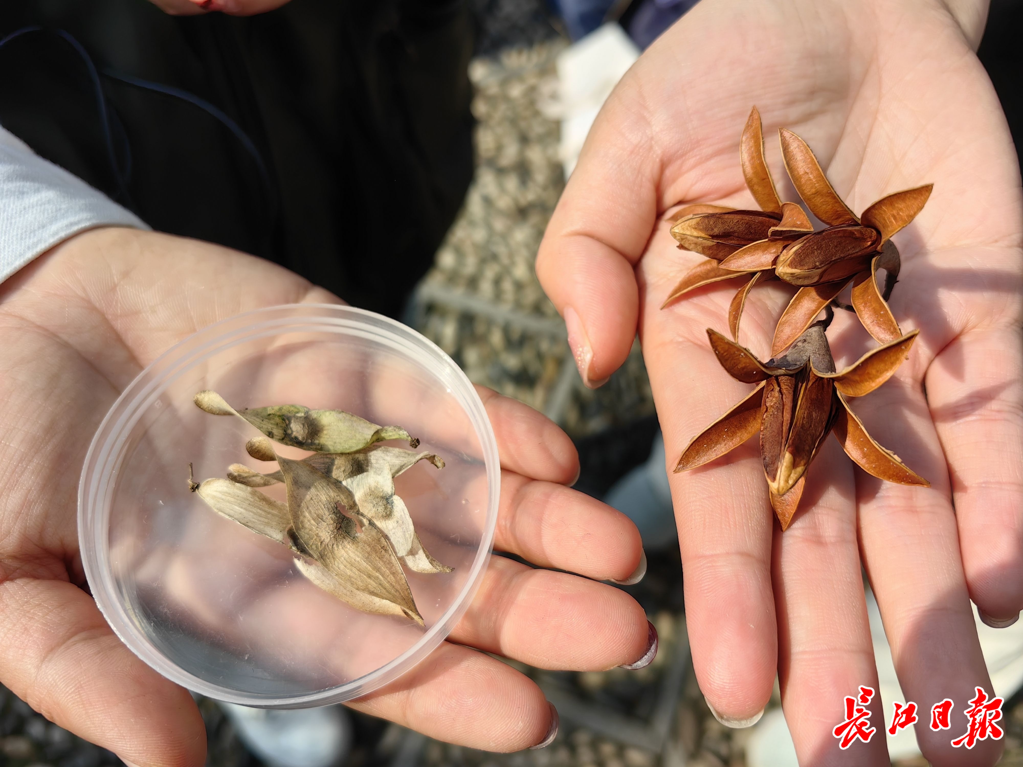 此外,还可以根据果实辨别。刘美玲掏出香椿和臭椿果实,二者区别明显:香椿的果实成熟后形如花朵,臭椿的果实则像飞机的螺旋桨。