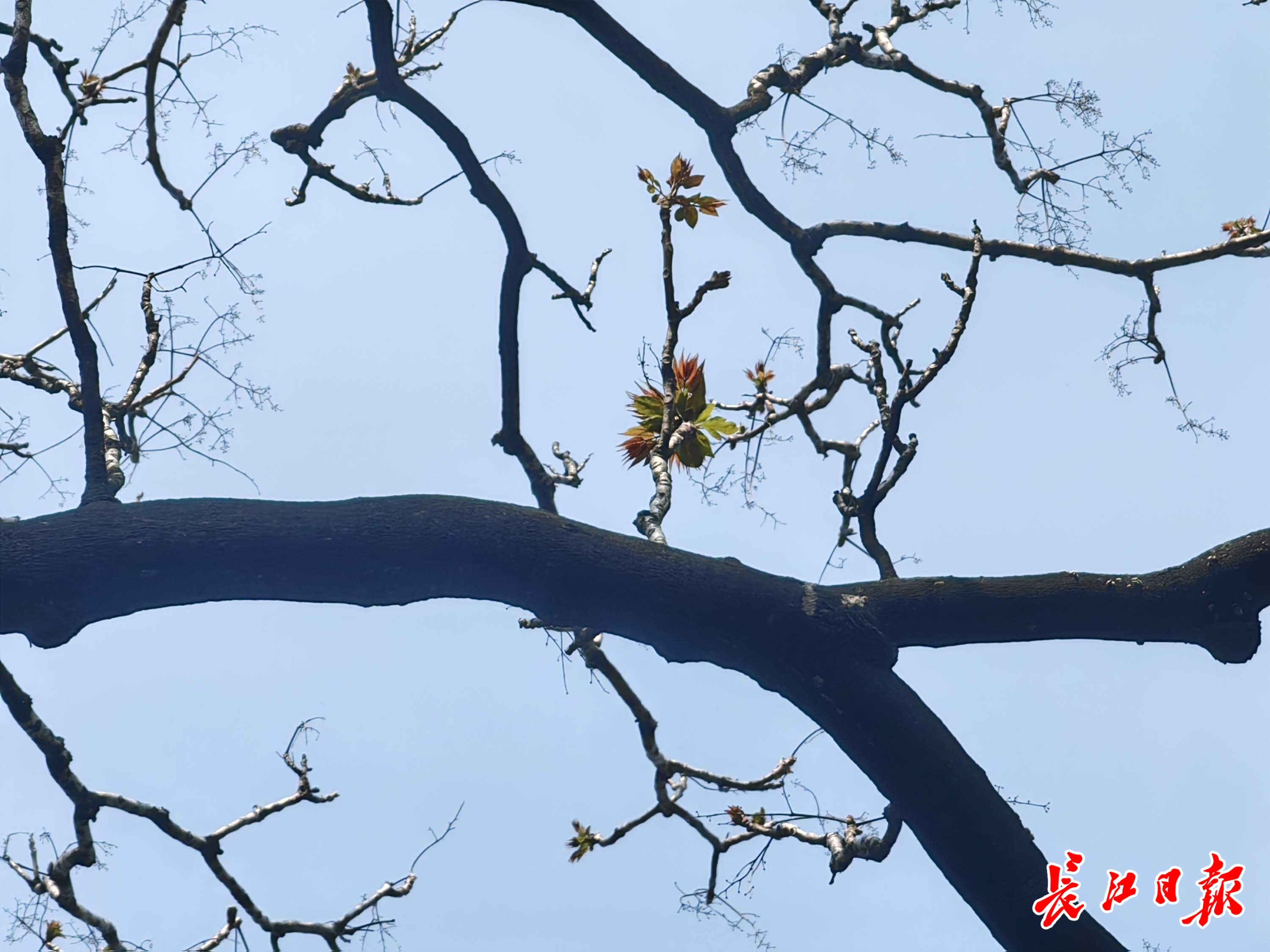 臭椿古树冒出的嫩芽。记者明眺生 摄
