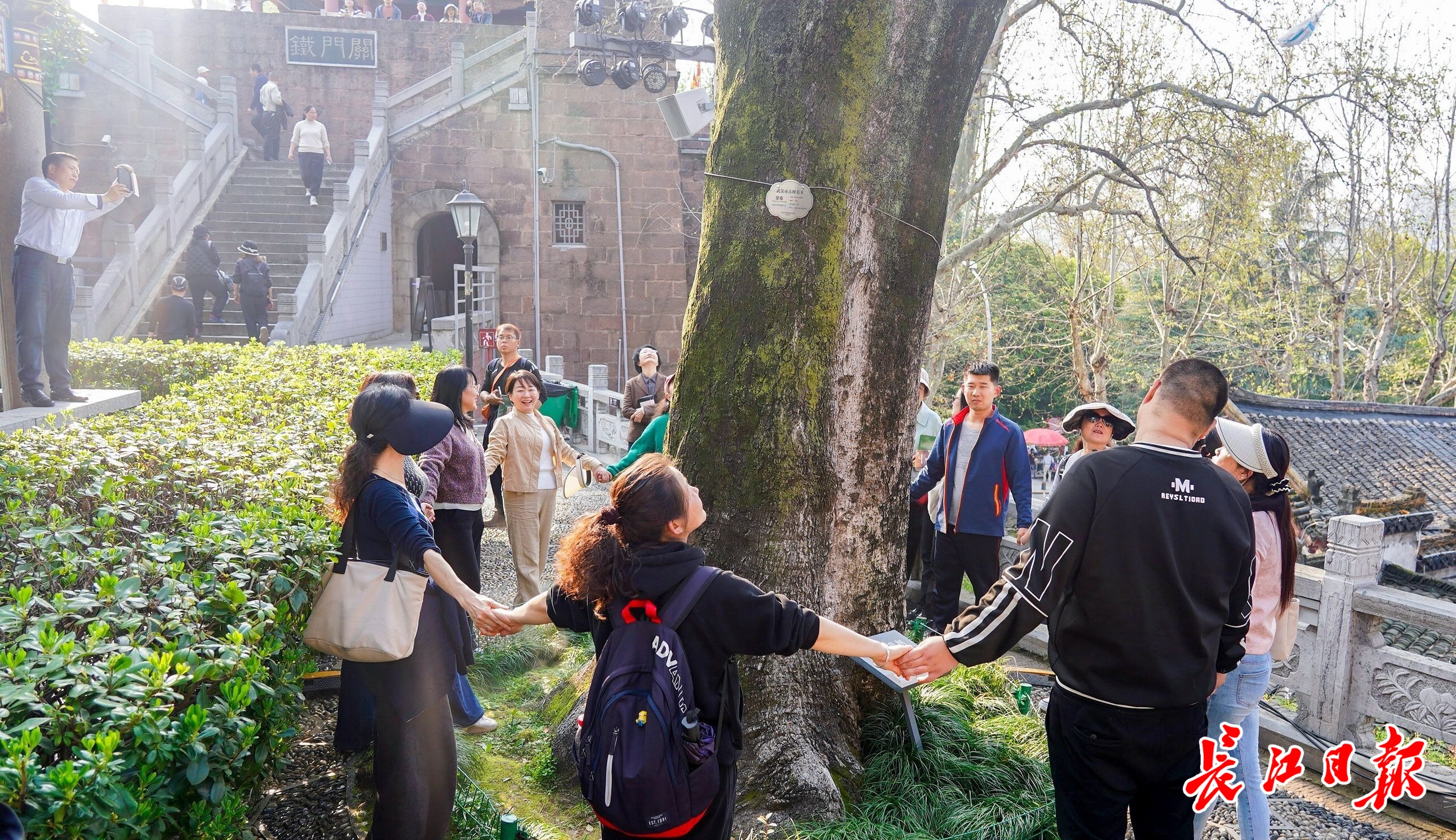 “抱抱江城古树”系列公益活动于3月11日在龟山公园启动。第二站活动由市园林和林业局、市妇联携手组织,拥抱对象为晴川阁大禹文化博物馆一株119岁的臭椿古树。这株古树生长在禹碑亭旁,高20米,胸围3.70米,需四人合抱。