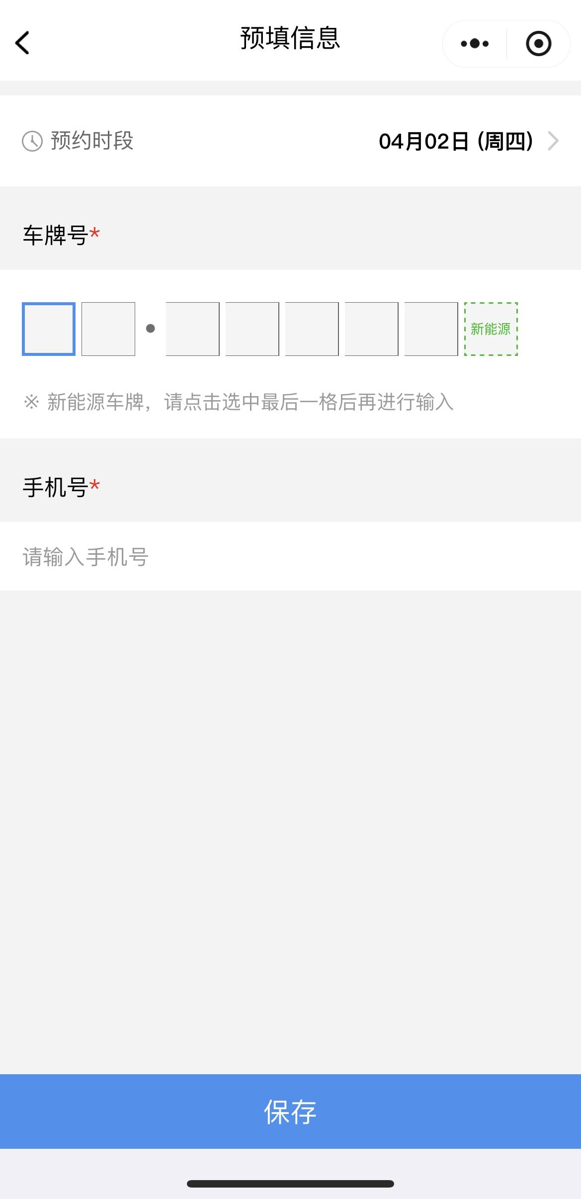 小程序页面显示:“可提前一天预约,每天上午8点开放最新一天的预约名额。”记者查看发现,3月31日和4月1日的名额都已约满,4月2日的还未开放。预约时需要填写手机号和车牌号。