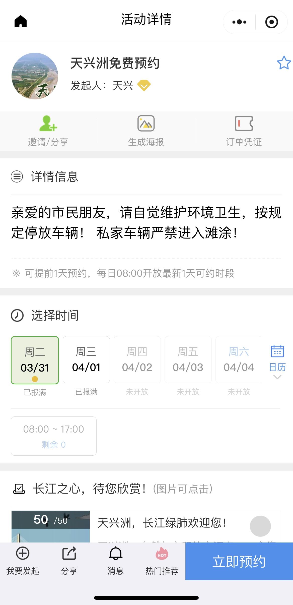 “天兴洲既是生态保护区,也是森林防火重点区域,难以一次性承载大量游客。”3月31日,记者从天兴洲所属洪山区天心乡政府有关部门获悉了上岛要预约的缘由。工作人员介绍,目前官方唯一的免费预约渠道为微信小程序“快预约”,每日仅限50个名额。此外,前往岛上的公共交通目前仅对岛民开放,普通游客只能选择预约后自驾上岛。
