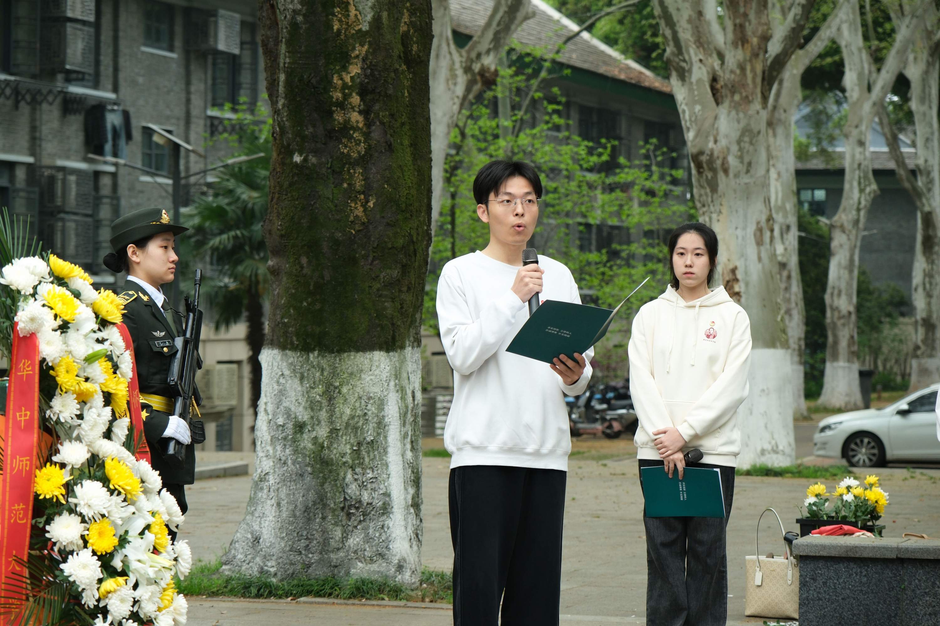 春风微拂,素花静绽,全体师生在恽代英雕像前肃立默哀,寄托对革命先辈的深切缅怀。