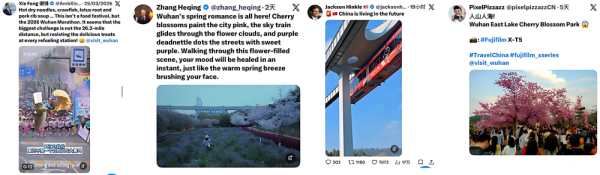 拥有300万粉丝的美国博主Jackson Hinkle发布武汉空轨视频时感叹:“中国正走进未来。”英国摄影师兼记者博主@PixelPizzazz连续多日与@VisitWuhan互动,主动推介东湖樱花。