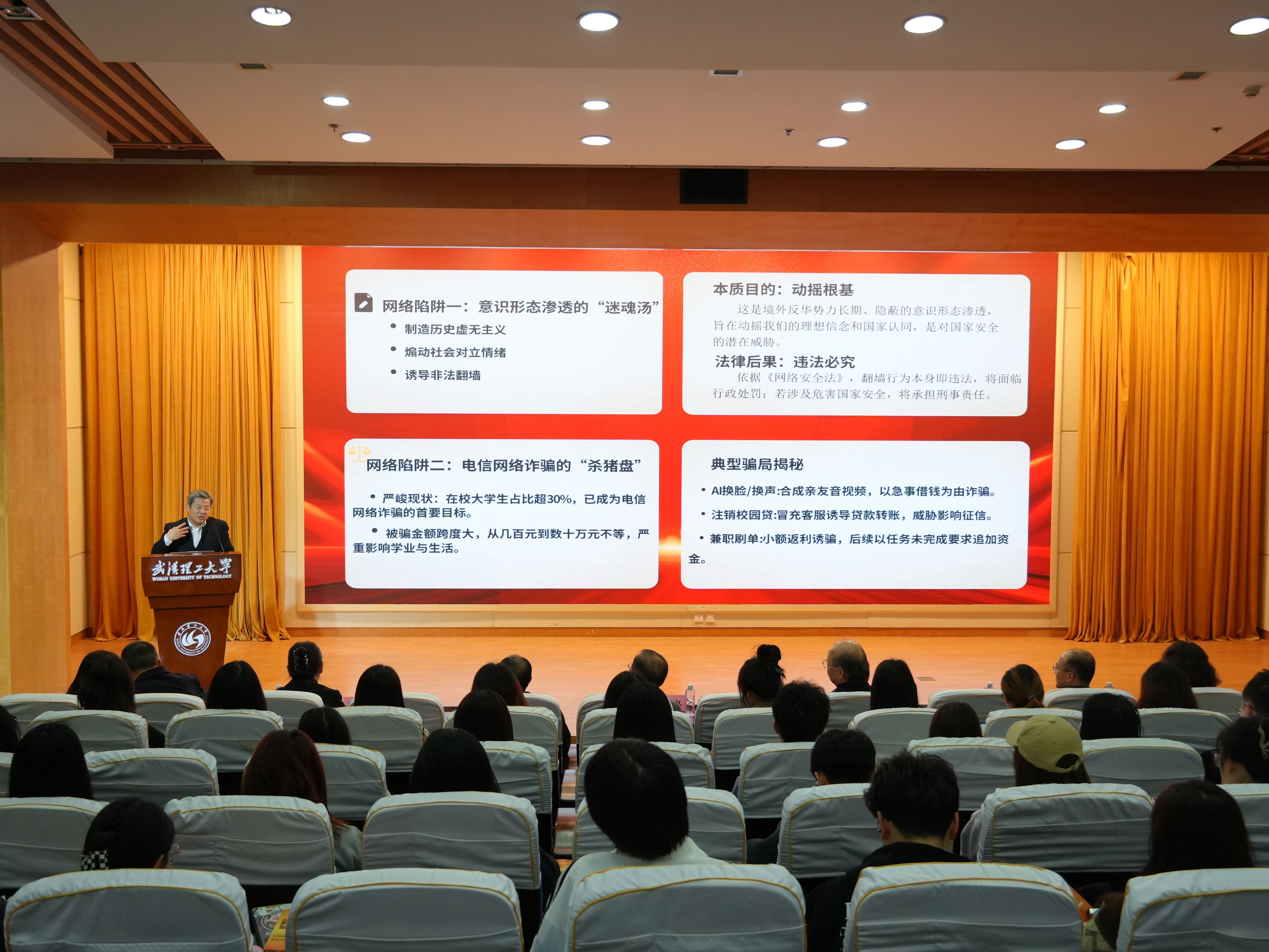 在主题宣讲环节,市交通运输局法学专家工作室成员结合实际案例,为师生剖析校园内国家安全风险点。北京观韬(武汉)律师事务所主任何应伟从全民国家安全教育日的由来入手,解读总体国家安全观的内涵。从科研保密、消防安全、信息刺探3个方面剖析校园内国家安全防范风险点。长江新区城管综合执法局郭煕锋分析当前美以伊军事冲突引发的能源价格剧烈波动,国际航运通道受阻,全球供应链面临严峻挑战,提出交通安全与国家安全的紧密联系。呼吁广大青年学子要以专业所学守护“国之大者”,以青春之力筑牢安全防线。市交通运输综合执法支队杨清晖结合武汉市交通运输行政执法实践,讲述了交通人守牢交通安全底线,保障公共安全与国家利益的感人故事。倡导大学生主动学习总体国家安全观,做国家安全的宣传者;从拒绝 “黑车”、爱护设施做起,做国家安全的参与者;对危害安全的行为敢于发声,做国家安全的捍卫者。湖北瑞通天元律师事务所主任助理张菁杨从今年春节档电影《惊蛰无声》剧情入手,讲解国家安全隐藏战线斗争的特点。分析军事博主“听风的蚕”因违反法律法规和平台规则被禁,解读当代大学生生活和学习中应当注意的国家安全事项。