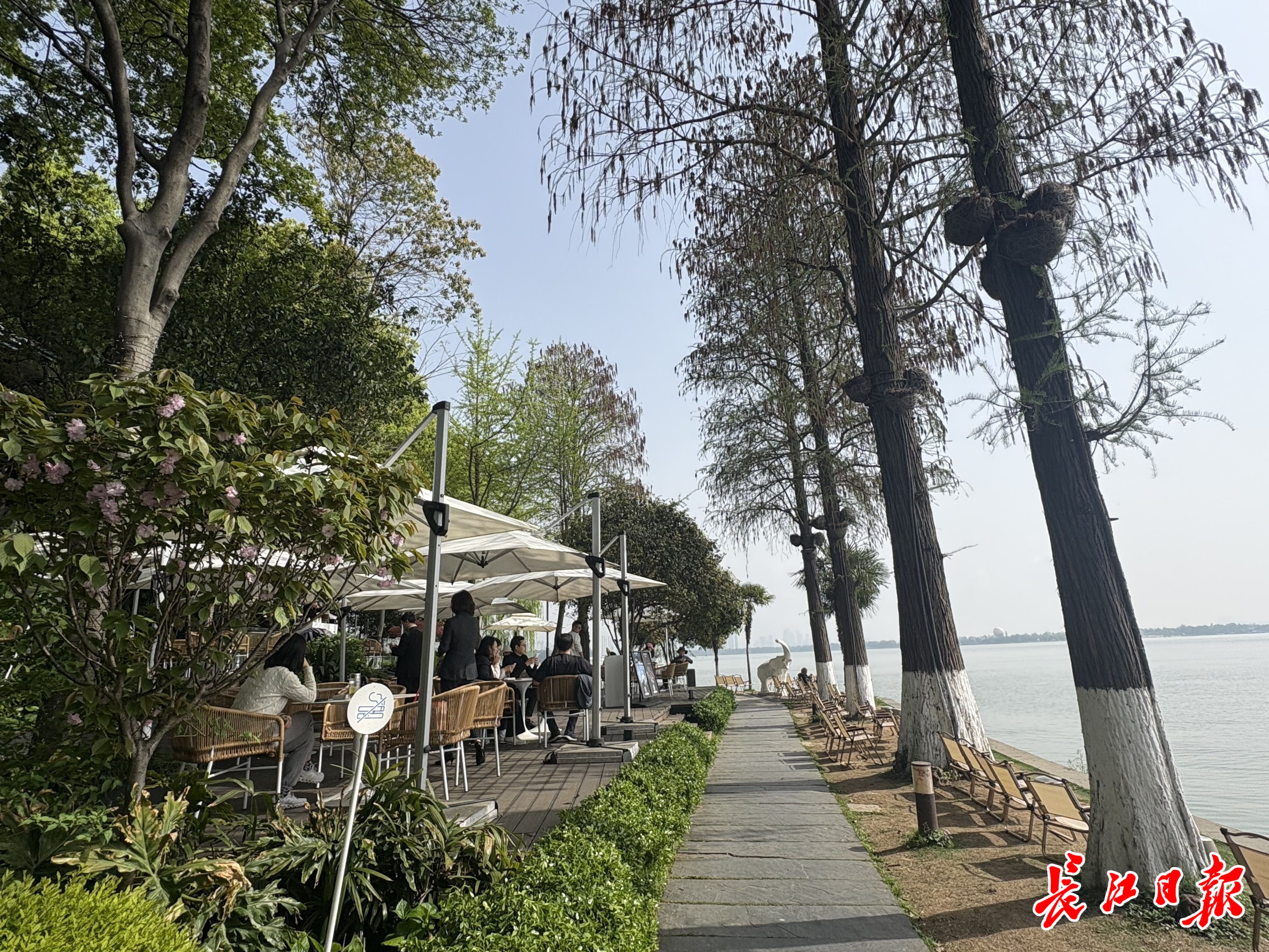 不仅是这家餐厅,旁边的两家咖啡馆同样因“环境好、能出片”吸引了不少年轻人。北京游客杨小姐举着一杯咖啡,让家人在湖边为她拍下一张侧脸照,镜头延伸出去,背后就是东湖。杨小姐满意地说,“必须发朋友圈的九宫格”。