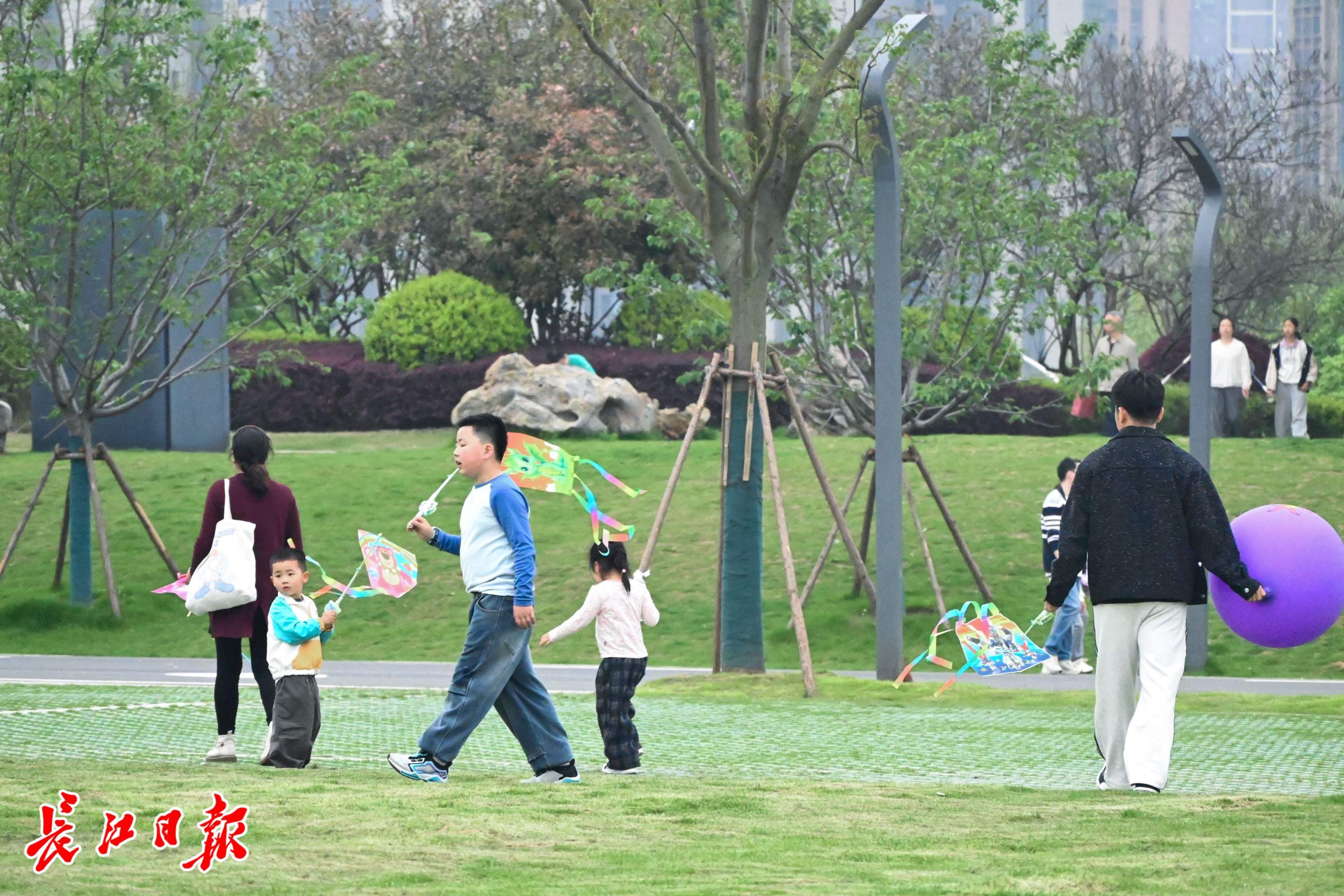 青山江滩的草坪上,不少家长带着孩子前来放风筝。记者郝天娇 摄
