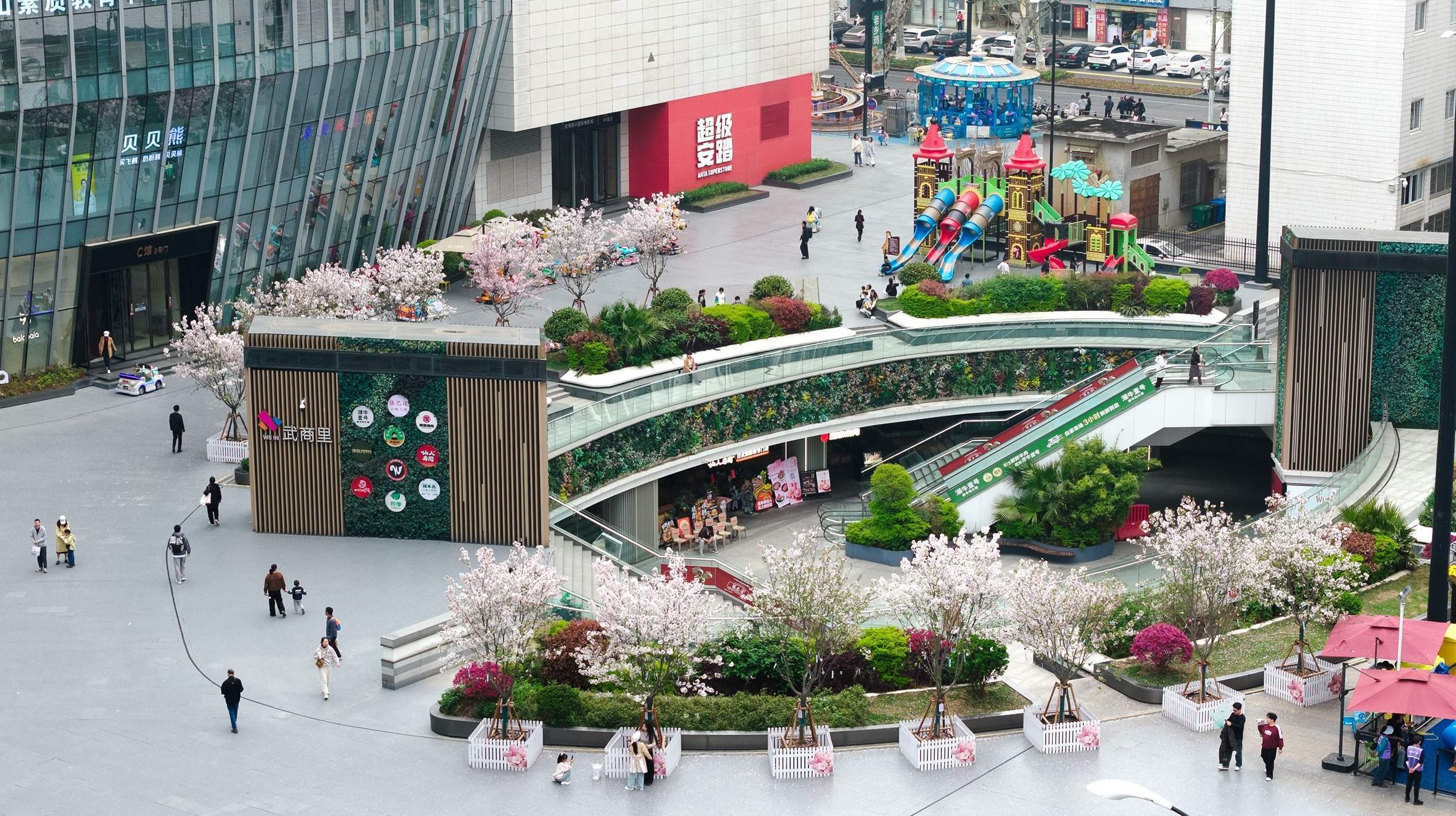 除了运动品类,餐饮和亲子业态也被同步带动。同在商场的餐饮区,老乡鸡、高越越、山城老炮等多家热门餐厅门前排起长队,等位从晚餐时段一直持续到晚上8点。商场打造的WS江豚樱花园、亲子游乐区等打卡点,也吸引了不少市民游客驻足拍照。