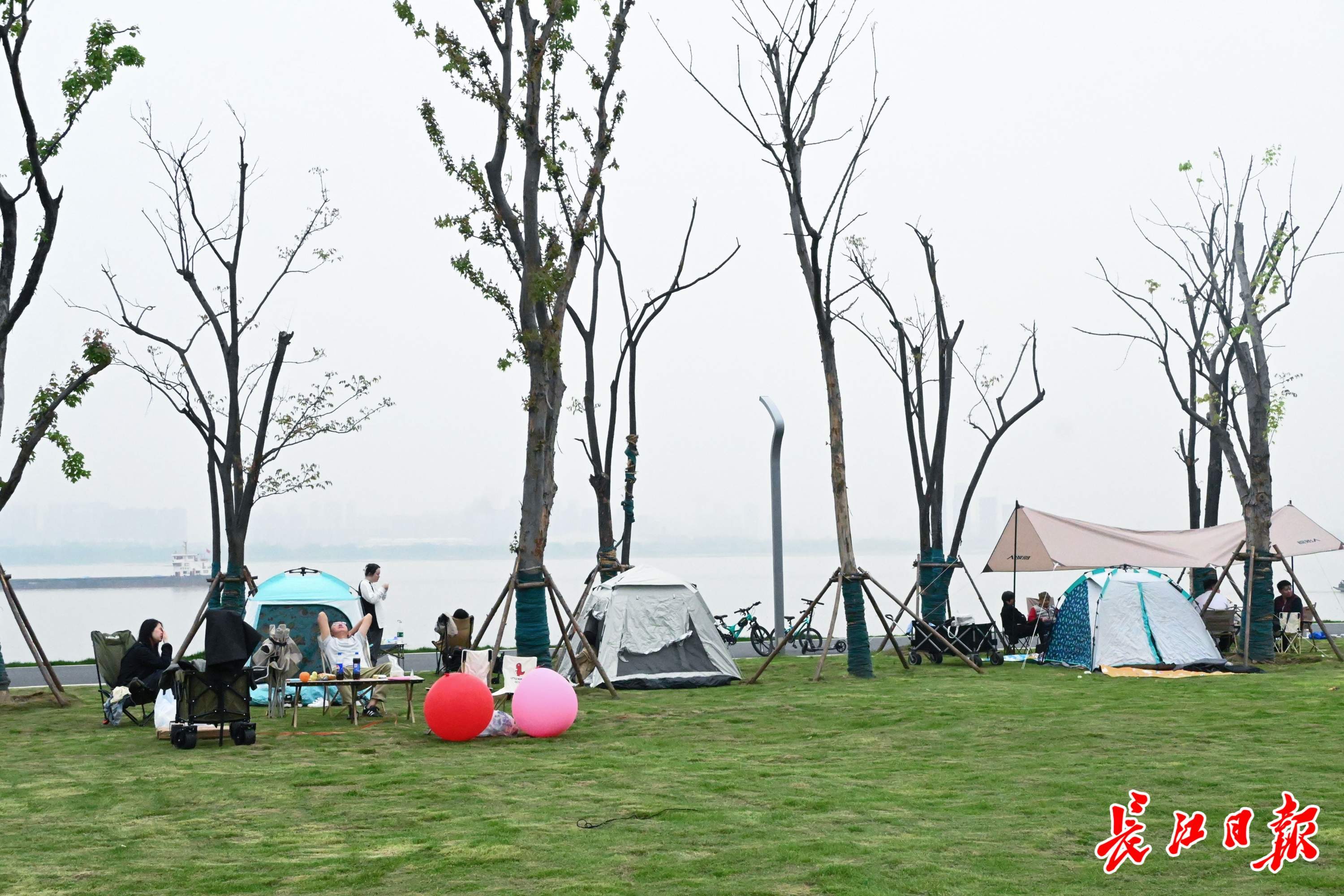青山江滩吸引不少游客前来露营。 记者郝天娇 摄