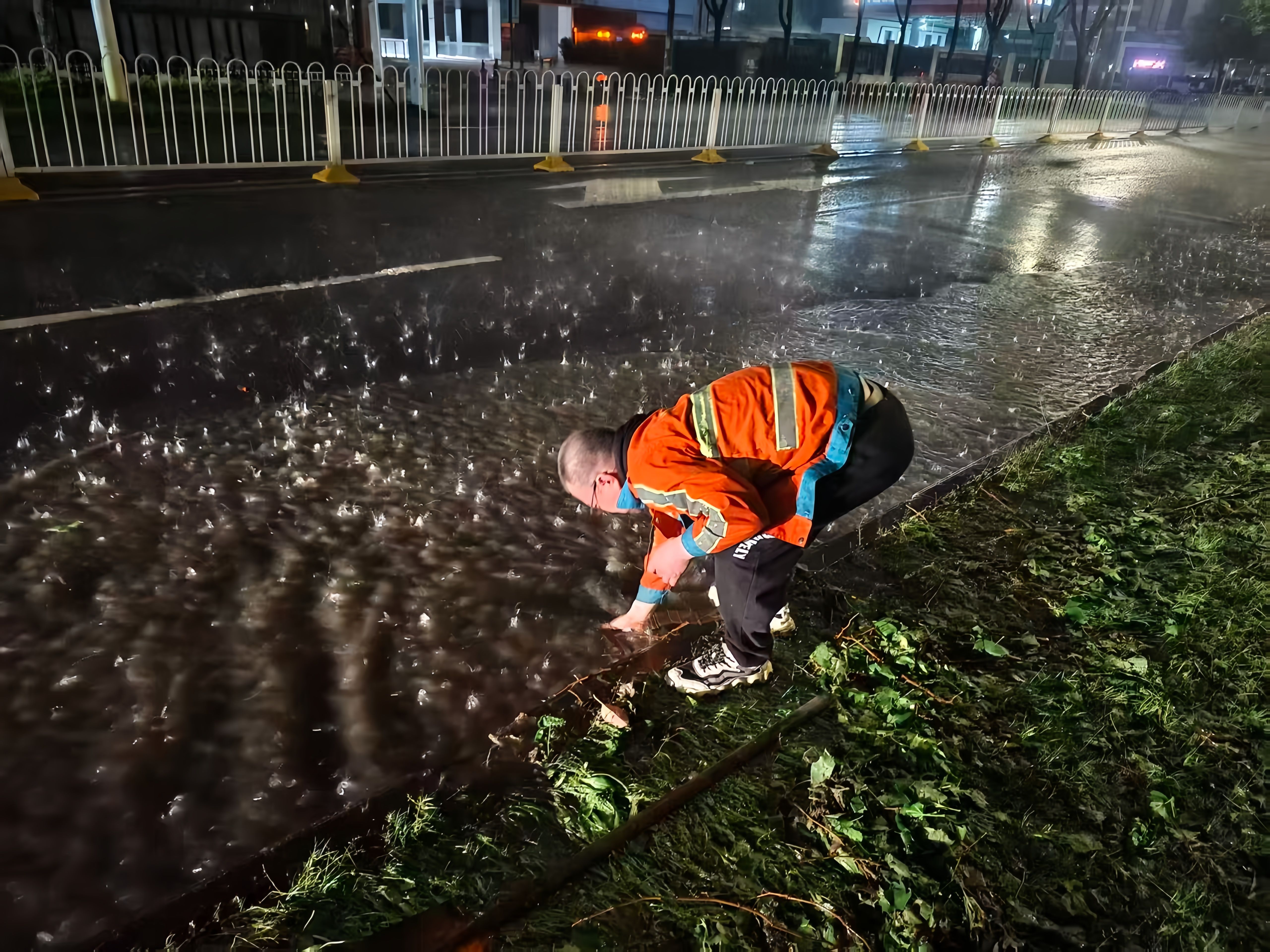 9日凌晨,环卫工人连夜清理下水道口淤积的杂物,保持排水畅通。 通讯员供图
