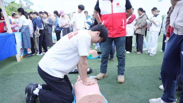 武汉市东湖高新区民警也来到活动现场开展《防踩踏安全课》实操教学,把防踩踏自救互救核心技能传授给大学生。
