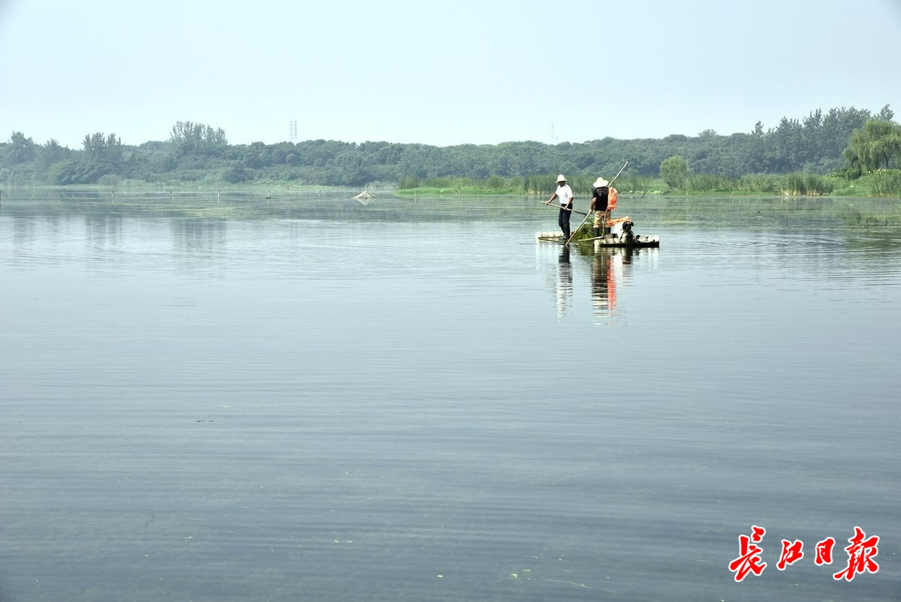 汤湖上正在打捞水草的作业船。长江日报记者戴红兵 摄