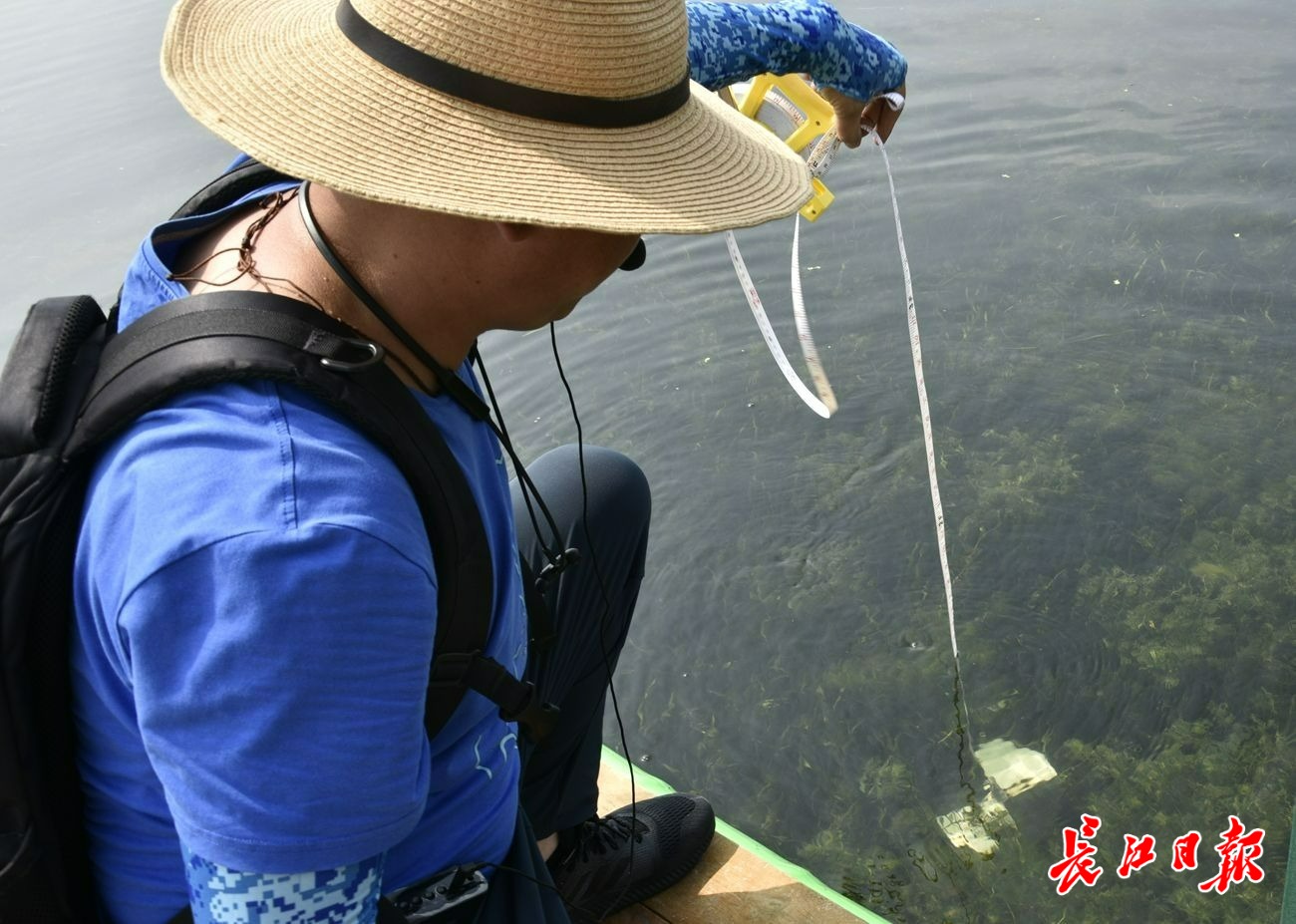 志愿者在用仪器测汤湖水质透明度。长江日报记者戴红兵 摄