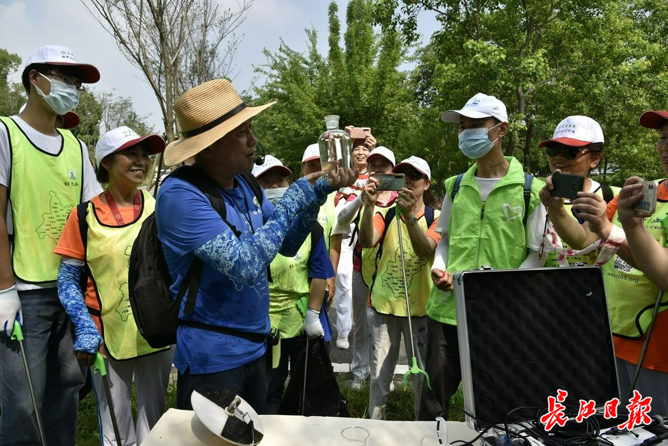 江汉大学的师生们也来当志愿者,该校环境工程系大一学生李龙凯说,自己是第一次参加环保活动,收获特别大,既学到了知识,又提升了自己的行动力,更好地认识到所学专业的社会认可度和需求度,下次活动还希望参加。