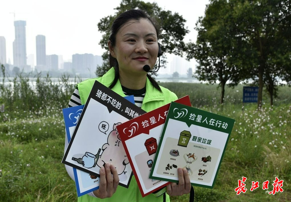 武汉经济技术开发区(汉南区)捡星人环保公益服务中心的肖金老师,现场讲解了垃圾分类的相关知识,带领志愿者边巡湖边捡拾垃圾,沿途向周边居民做环保宣传。