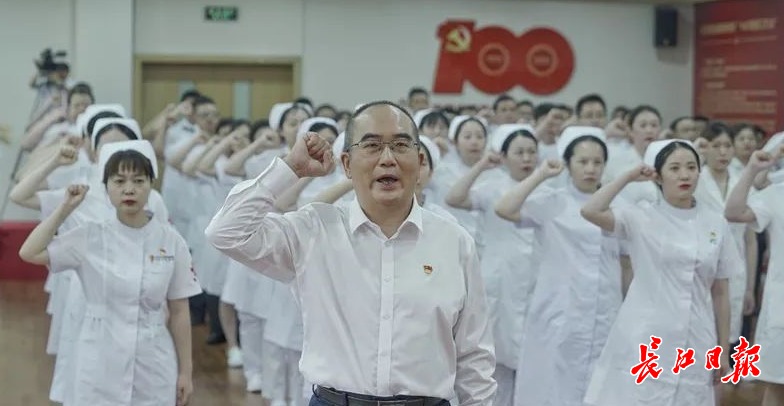 似火六月,激情澎湃。在庆祝中国共产党成立100周年之际,100名新党员代表身着白大褂,胸前佩戴党员徽章,列队前往武汉市金银潭医院参加宣誓活动。