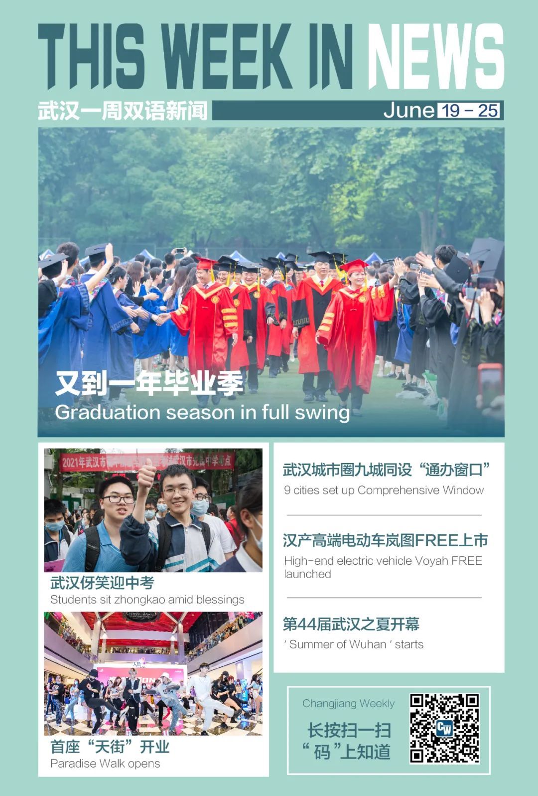 Universities and schools in Wuhan are now celebrating the graduation season in various ways. To mark the occasion, each of them is observing their graduation customs while bringing forth new ideas at the same time. We can see the graduation parade made up of modern agricultural equipment at Huazhong Agricultural University on June 20, the largest graduation ceremony ever held at Central China Normal University which was attended by 11,184 graduates of 2020 and 2021 on June 13, and the American-style graduation ceremony staged at Wuhan Yangtze International School on June 17.