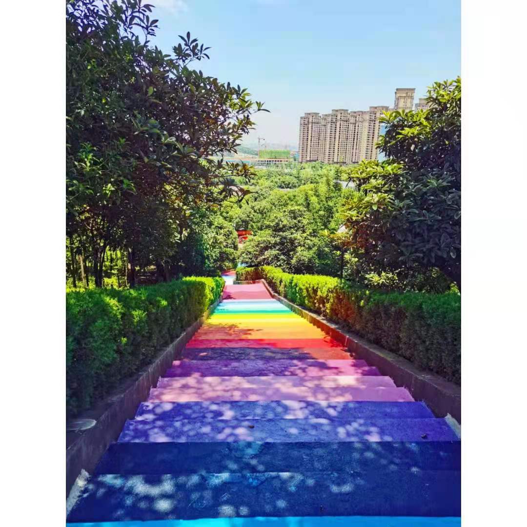 据了解,该校这处阶梯道路位于梅南山山腰处,名为“步步高升成功阶梯”,共有135个台阶。近日,该校艺术设计学院环境艺术设计专业8名学生接到一个特殊的“作业”,将这里的阶梯改造为“彩虹阶梯”。