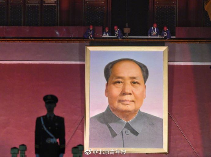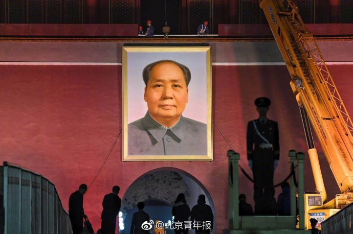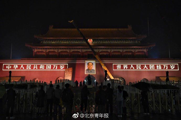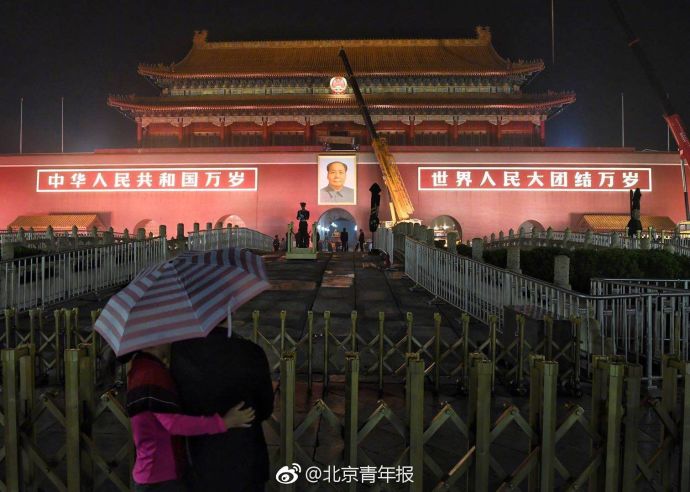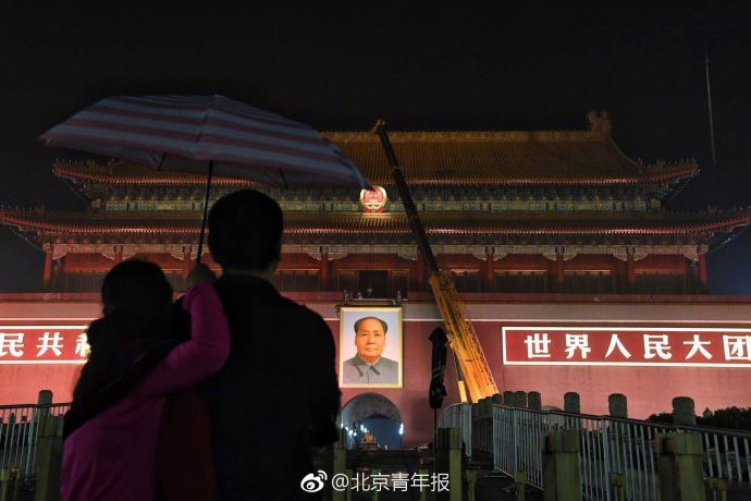 27日晚11:02分,小雨中天安门城楼毛主席画像迎来每年一次的“换新”工作。在施工人员细心、安全地操作下,经历了一年风雨的旧画像被缓缓取下,最新绘制而成的毛主席画像悬挂在了天安门城楼上。整个换像过程持续了1个多小时。