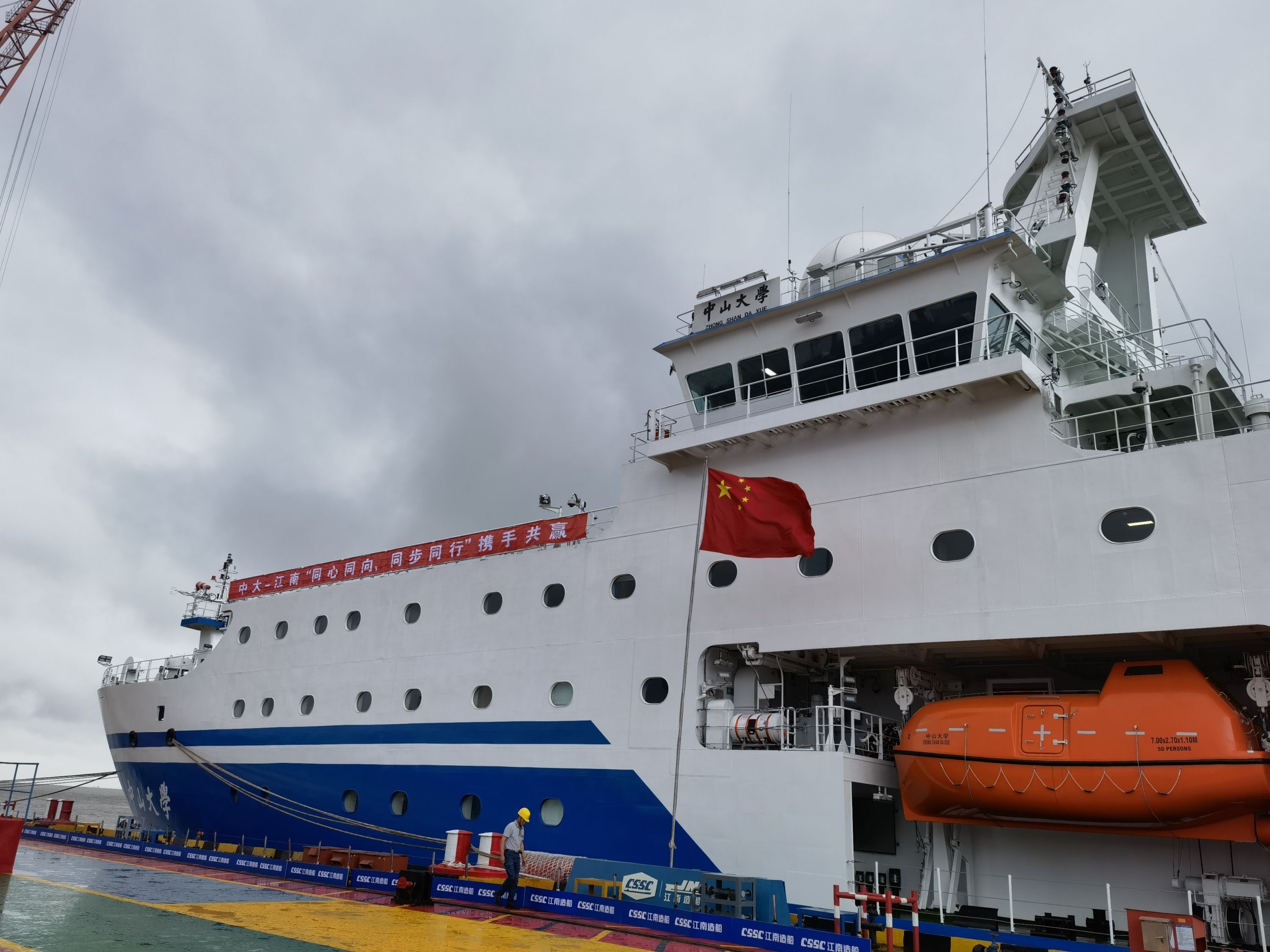 据介绍,“中山大学”号于2016年6月获教育部批复立项,2019年10月由中山大学委托中国船舶江南造船厂建造,是目前国内设计排水量最大、综合科考性能最强的新一代大型海洋综合科考实习船,排水量6880吨,续航力15000海里,具备全球航行能力且能毗邻极地冰区作业。