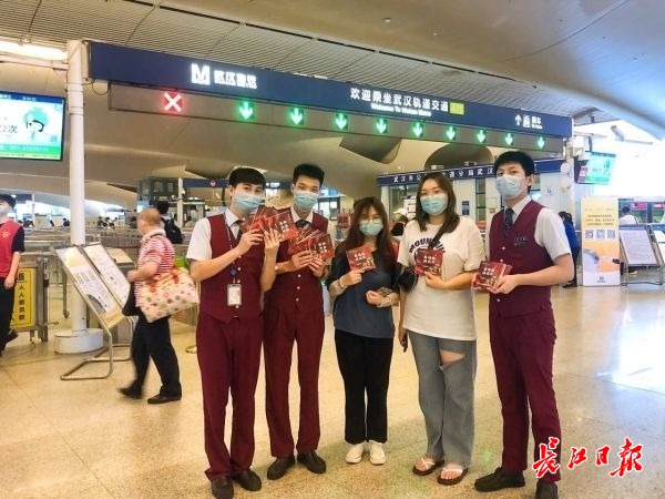 “您可以在长江两岸欣赏到绝美的庆祝建党100周年主题灯光秀;八路军武汉办事处旧址7月1日当天有编织中国结的活动……”来自武汉地铁姚婕志愿服务总队的志愿者们热情地为乘客介绍着手册上的红色旅游景点和系列庆祝活动,免费向大家发放手册,提供旅游引导服务。