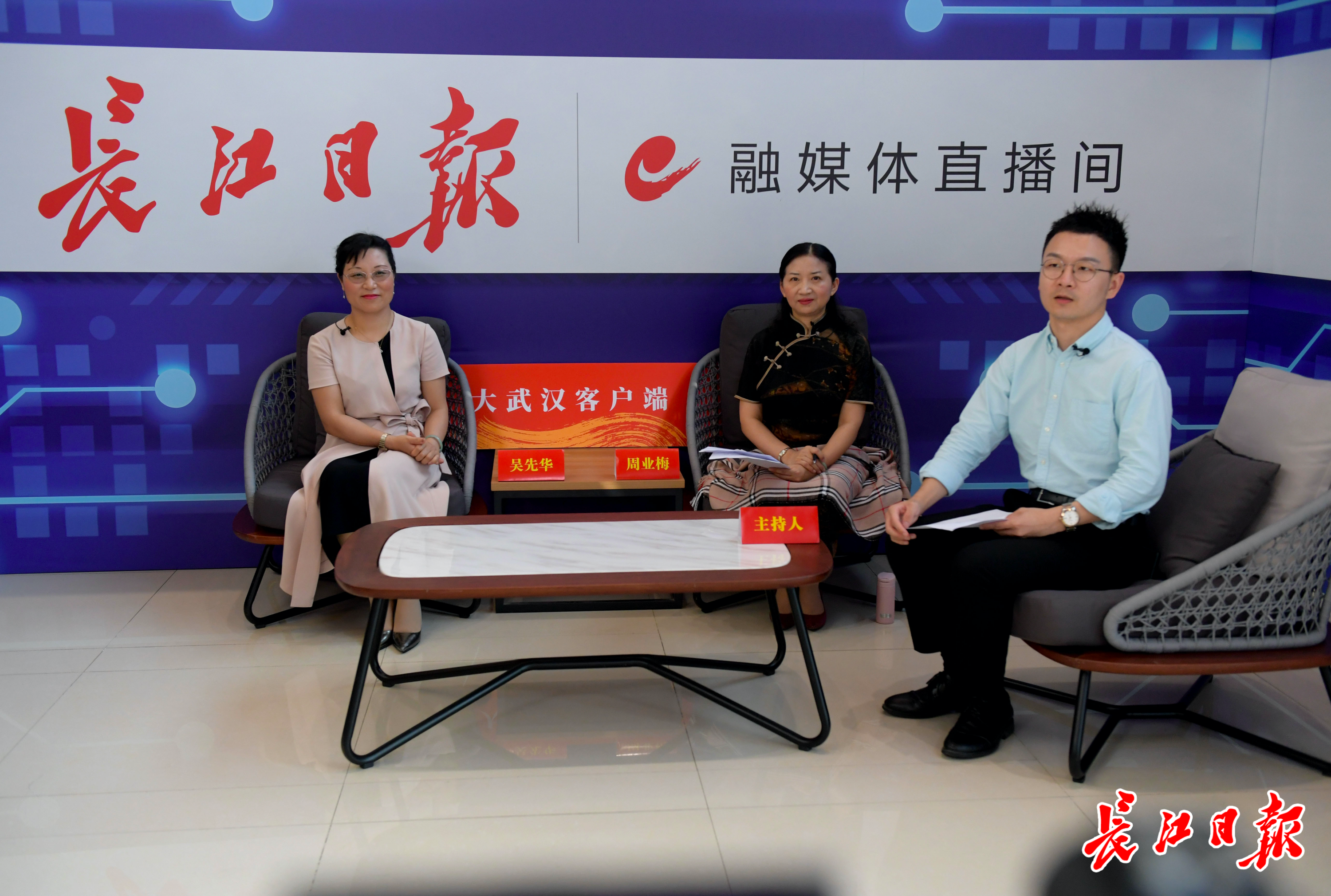 吴先华(左)、周业梅(中)做客长江日报大武汉客户端直播间。 长江日报记者刘斌 摄