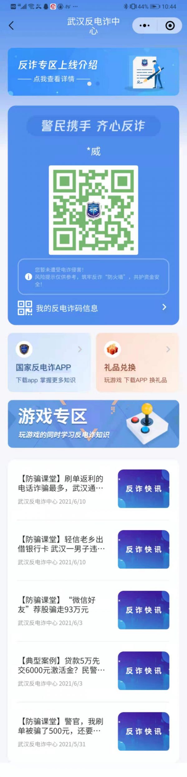 长江日报记者获悉,武汉反诈专区设计了风险提示、反诈APP、趣味游戏、防诈宣传四个板块。专区用户一经授权,即可获得反诈码,初始为绿码。绿码有可能变为黄码、红码、裂码,这种变化是根据用户风险等级、是否被骗等情况来确定的。