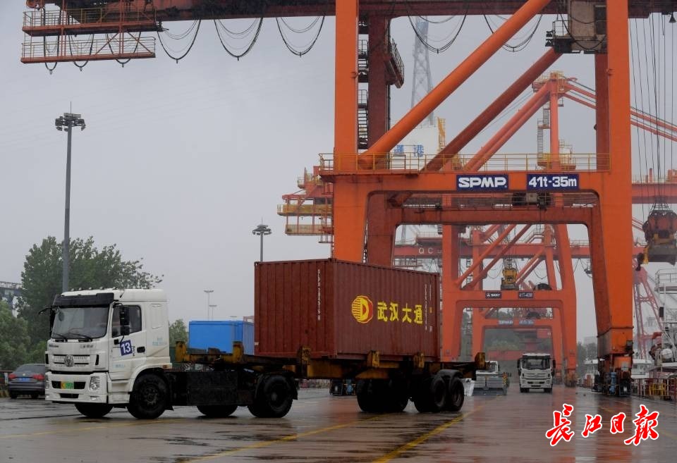 装载日本汽车的集装箱通过指定运输卡车统一运输至吴家山中心站。长江日报报记者刘斌 摄